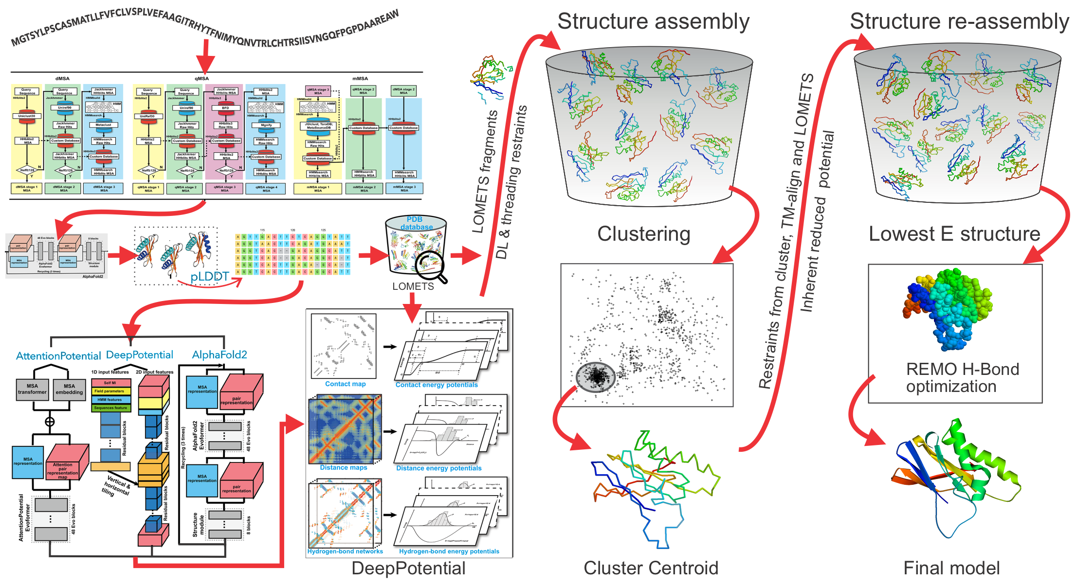As shown in Figure 1 (upper panel), starting from a query sequence, the pipeline begins with multiple sequence alignment (MSA) generation using DeepMSA2. Structural templates and alignments are then identified by LOMETS3, which combines multiple contact- and profile-based threading algorithms. In parallel, multiple deep learning models, including AttentionPotential, DeepPotential, and AlphaFold2 (optional), are extended to predict spatial restraints, including contact/distance maps and hydrogen-bonding networks. These predictions are merged with LOMETS3-derived restraints into a unified potential termed "DeepPotential".