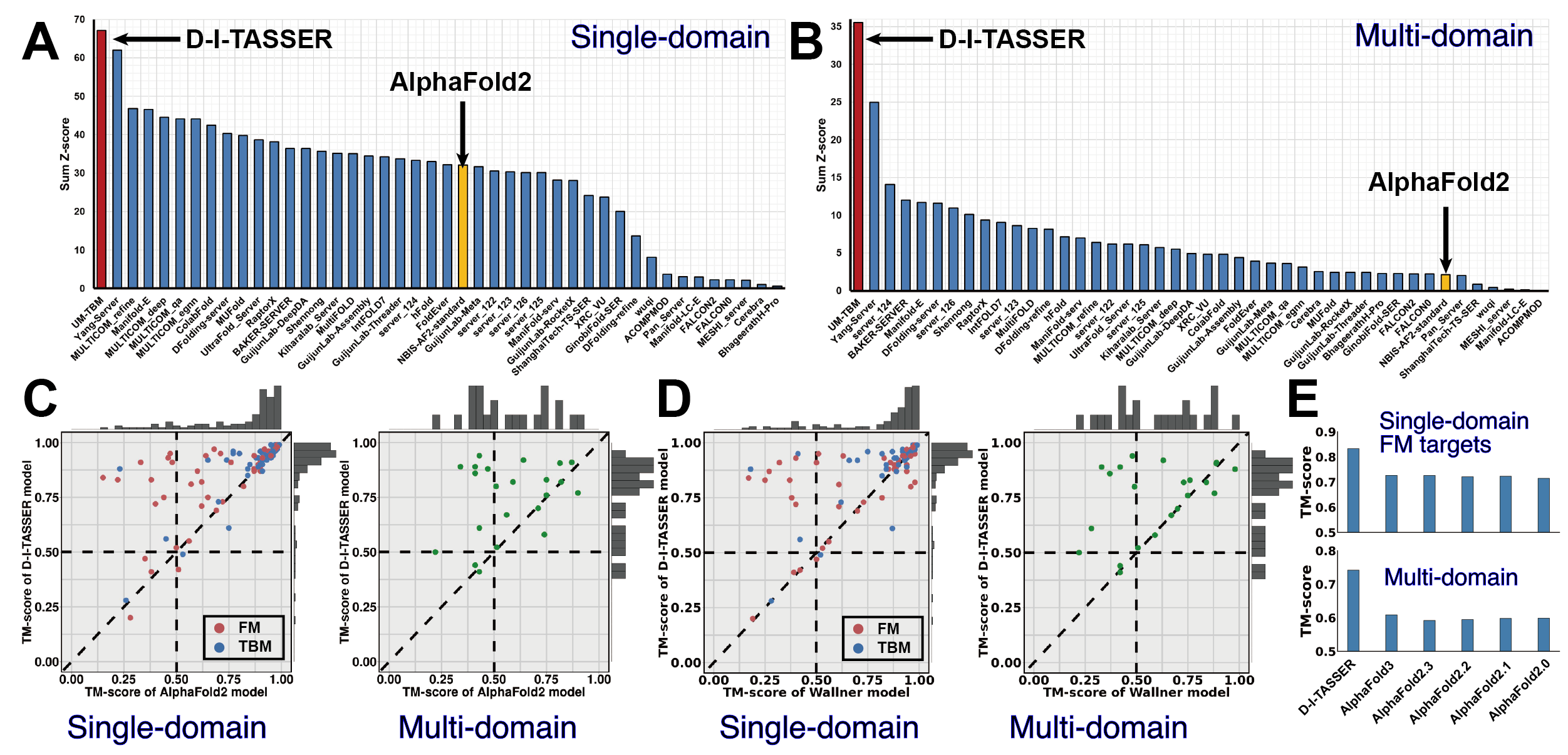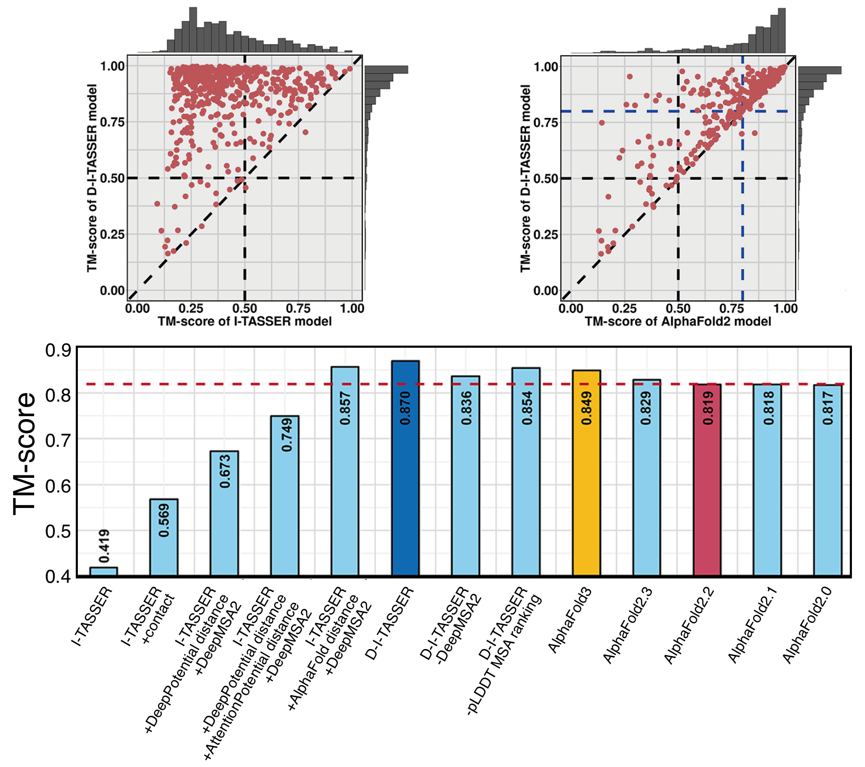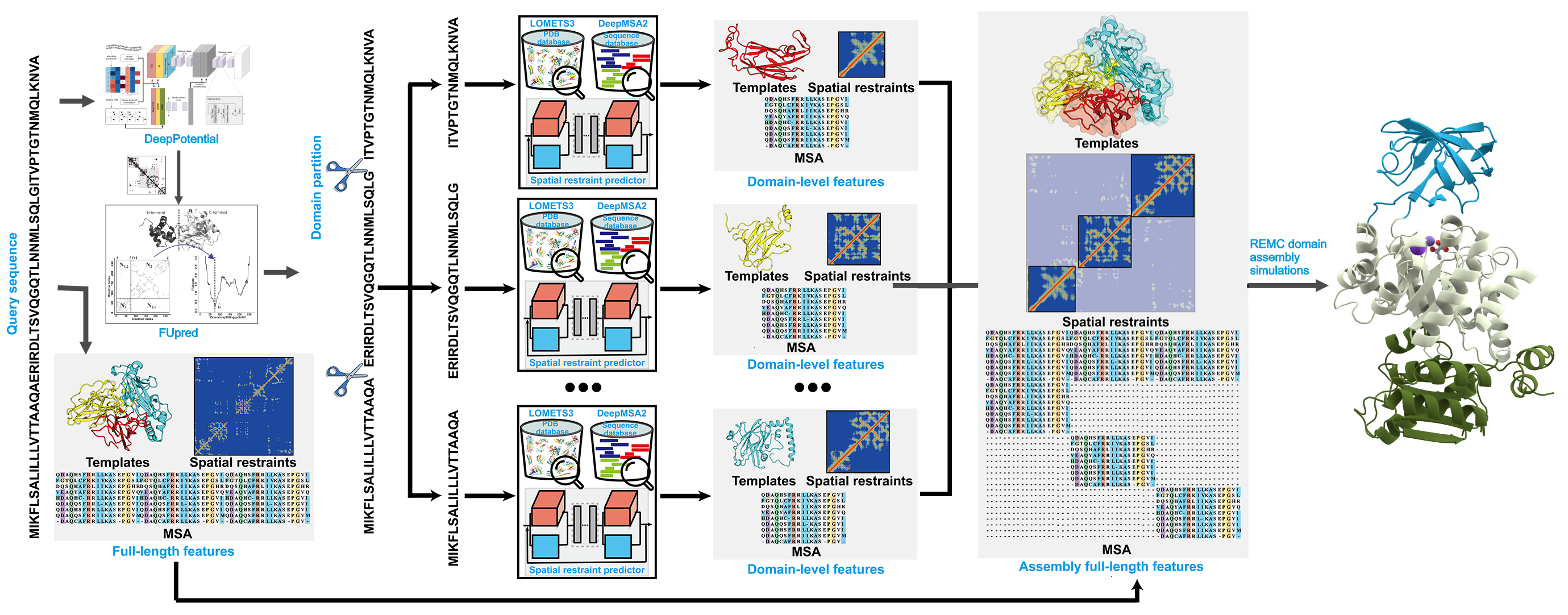 Figure 1 (lower panel) outlines the extension of D-I-TASSER for multi-domain protein modeling. Starting from the full-length sequence, a consensus of FUpred and ThreaDom is used to identify domain boundaries, where domain-level models are independently constructed using the single-domain D-I-TASSER protocol. Meanwhile, full-length MSA, spatial restraints, and template libraries are built from the full-chain sequence. The final full-chain structure is assembled using full-length D-I-TASSER simulations, guided by both domain-specific and global spatial restraints. Technically, domain-level folding of the full-length model is primarily driven by domain-specific threading and deep learning models, while the relative orientations between domains are determined by full-chain deep-learning restraints, inter-domain threading alignments, and the I-TASSER knowledge-based force field.