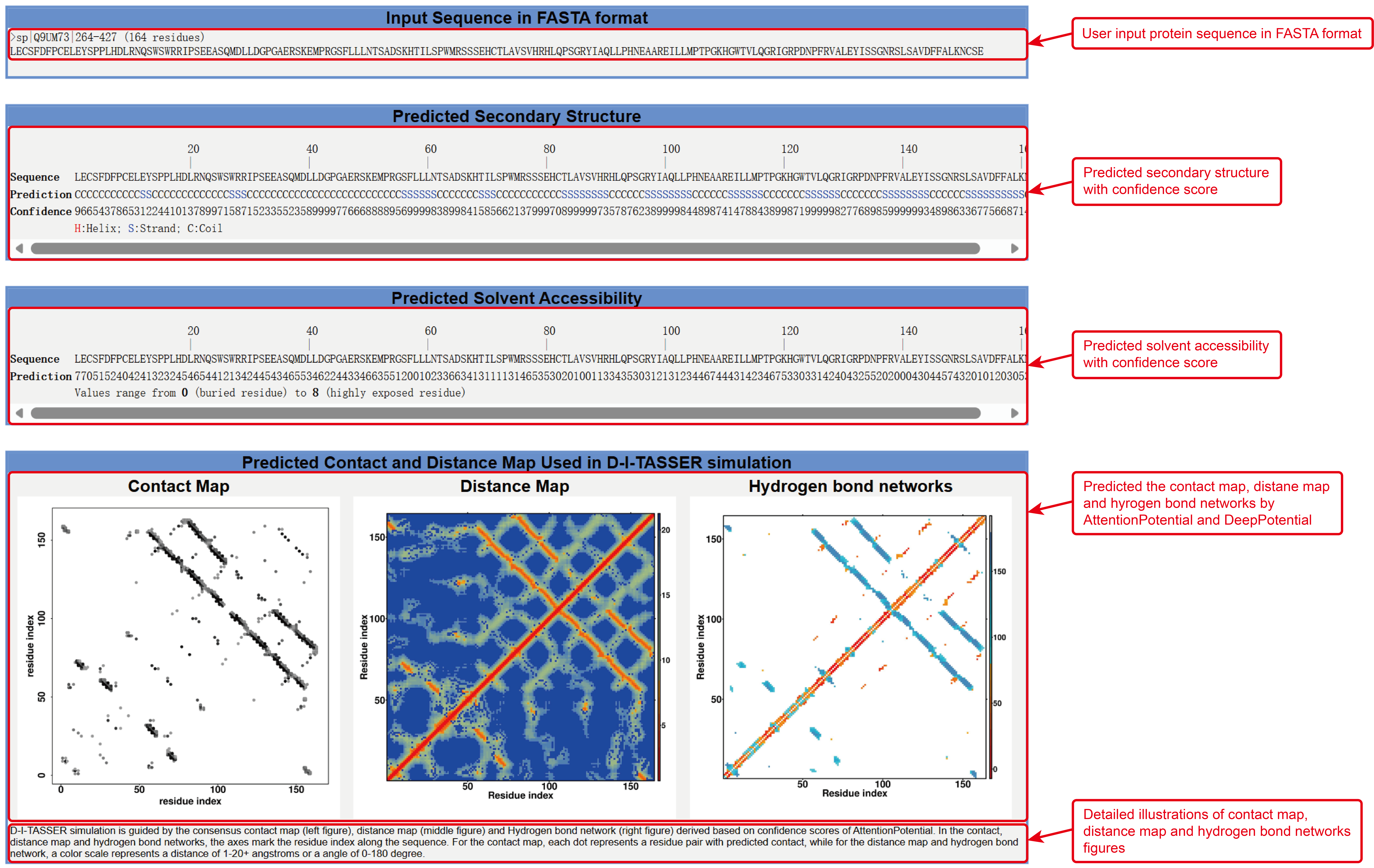 Figure 5. Secondary structure, solvent accessibility, contact map,distance Map, and hydrogen bond networks information in the D-I-TASSER output. br>