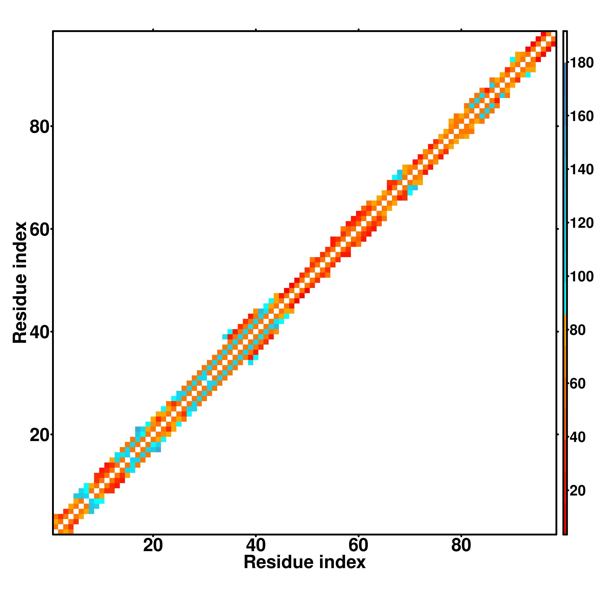 while for the distance map and hydrogen bond network, a color scale represents a distance of 1-20+ angstroms or a angle of 0-180 degree.