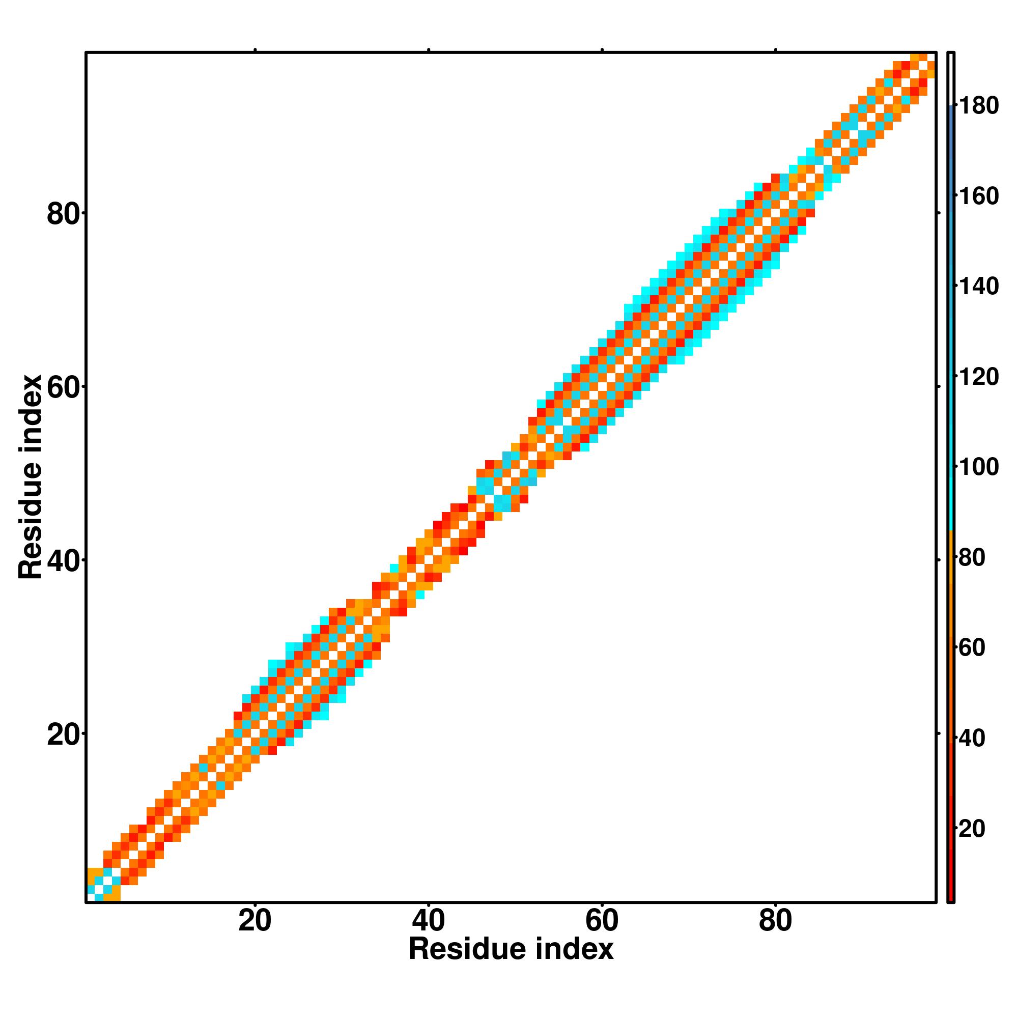 while for the distance map and hydrogen bond network, a color scale represents a distance of 1-20+ angstroms or a angle of 0-180 degree.