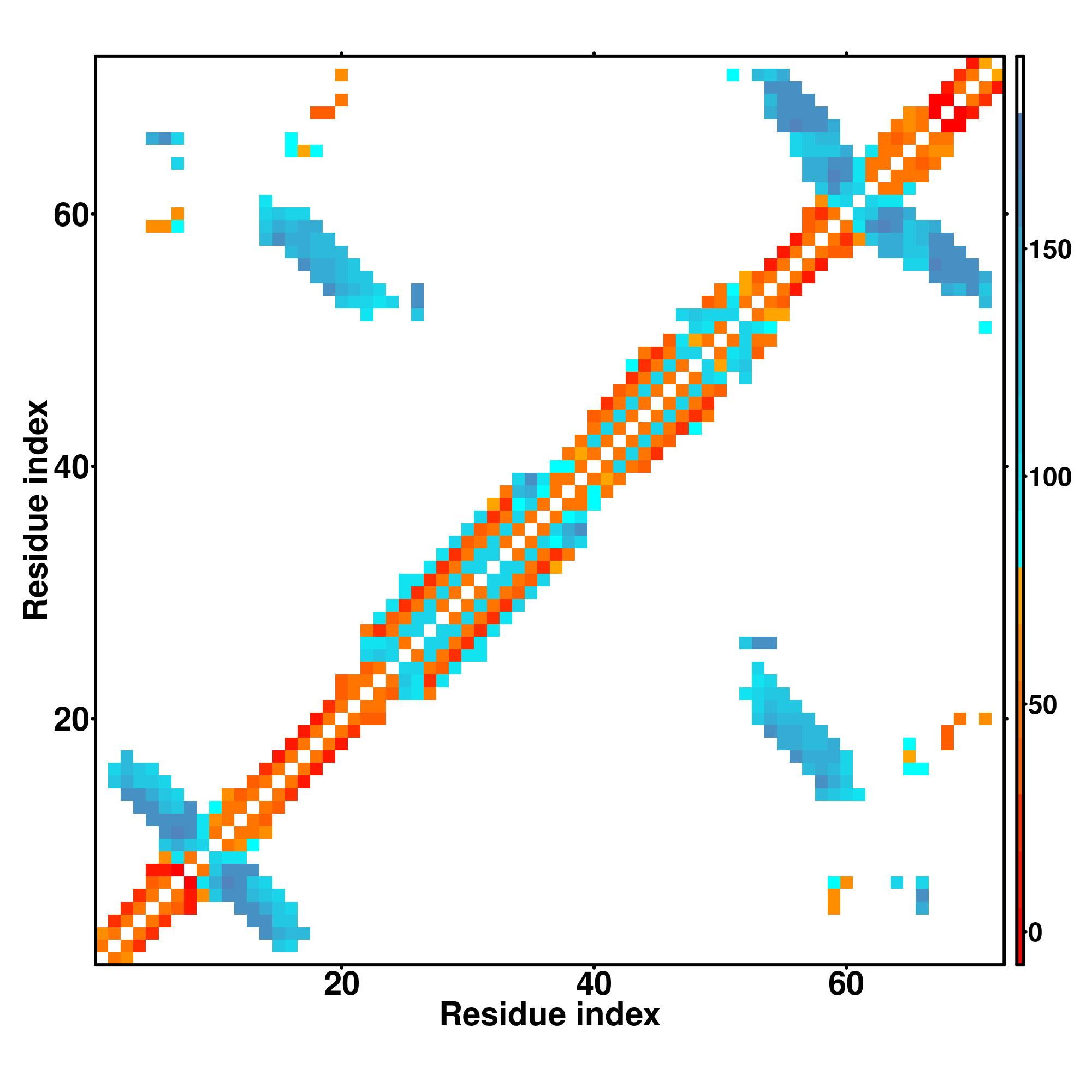 while for the distance map and hydrogen bond network, a color scale represents a distance of 1-20+ angstroms or a angle of 0-180 degree.
