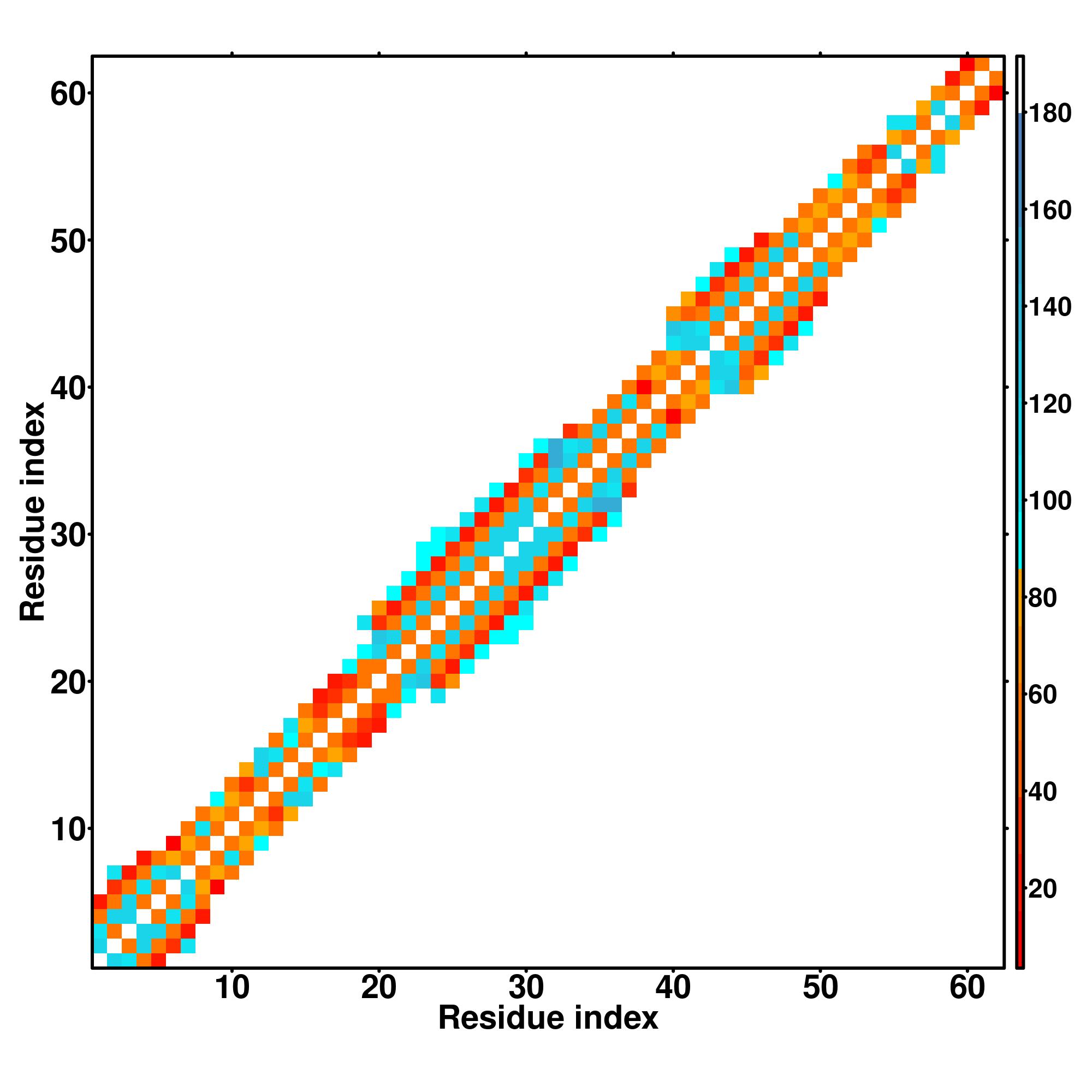 while for the distance map and hydrogen bond network, a color scale represents a distance of 1-20+ angstroms or a angle of 0-180 degree.