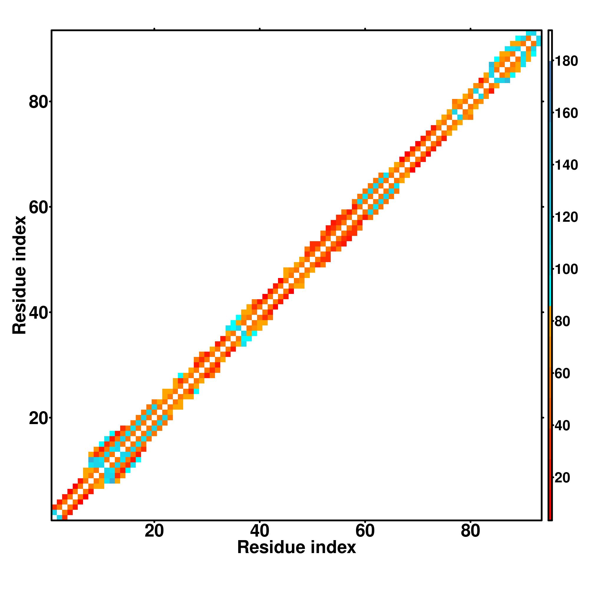 while for the distance map and hydrogen bond network, a color scale represents a distance of 1-20+ angstroms or a angle of 0-180 degree.