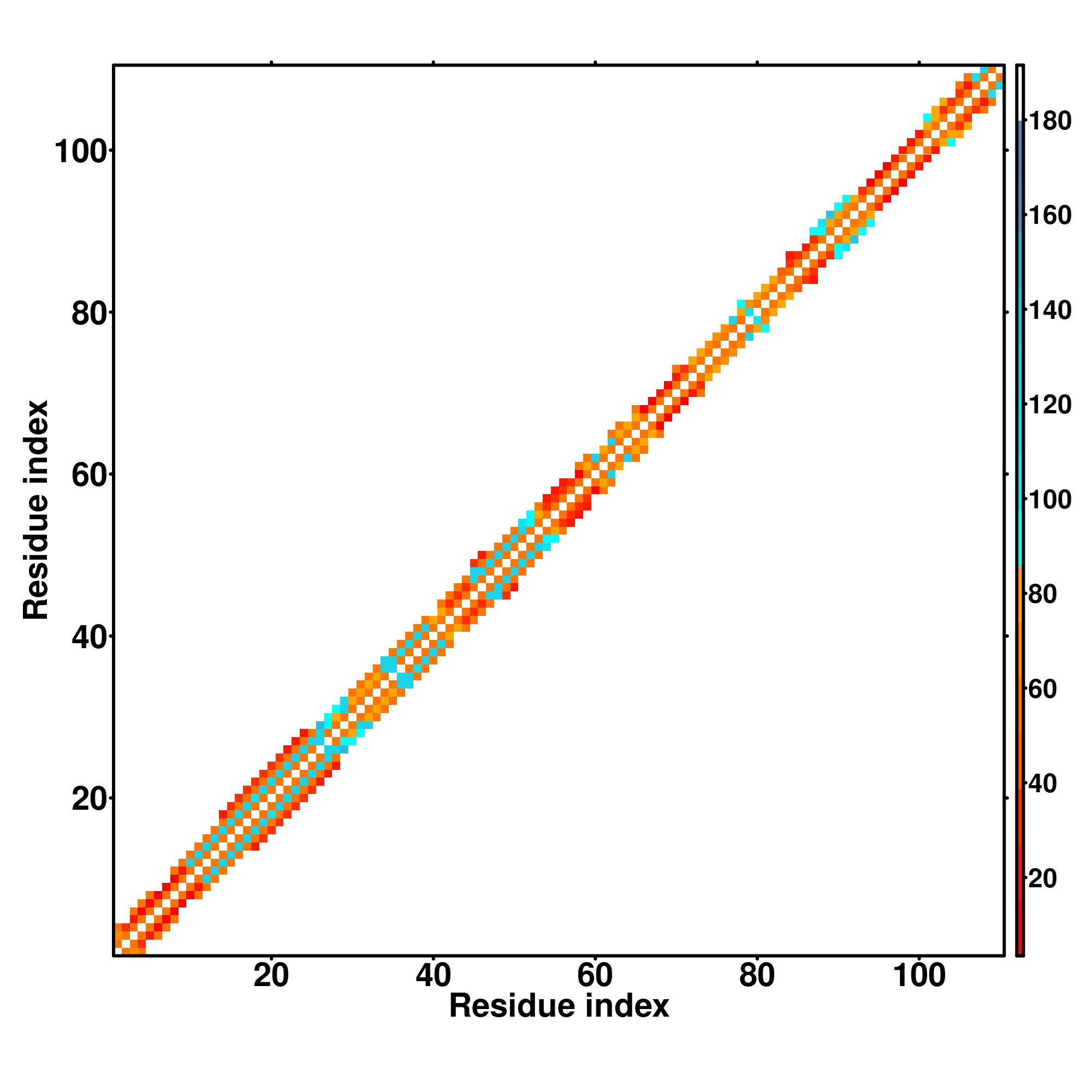 while for the distance map and hydrogen bond network, a color scale represents a distance of 1-20+ angstroms or a angle of 0-180 degree.