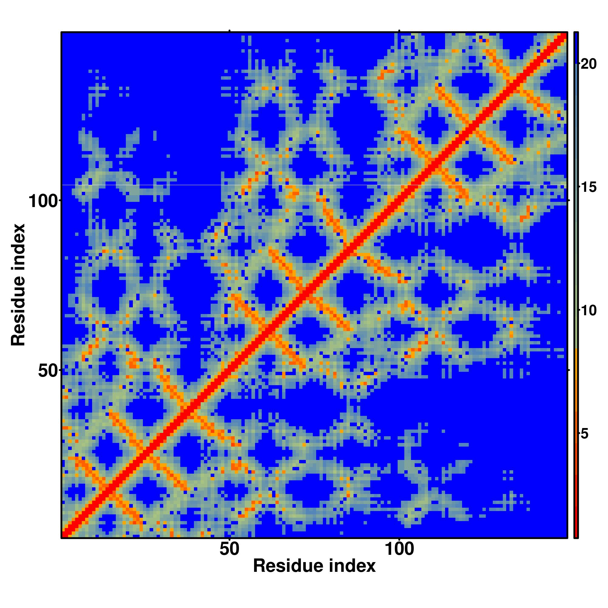 while for the distance map and hydrogen bond network, a color scale represents a distance of 1-20+ angstroms or a angle of 0-180 degree.