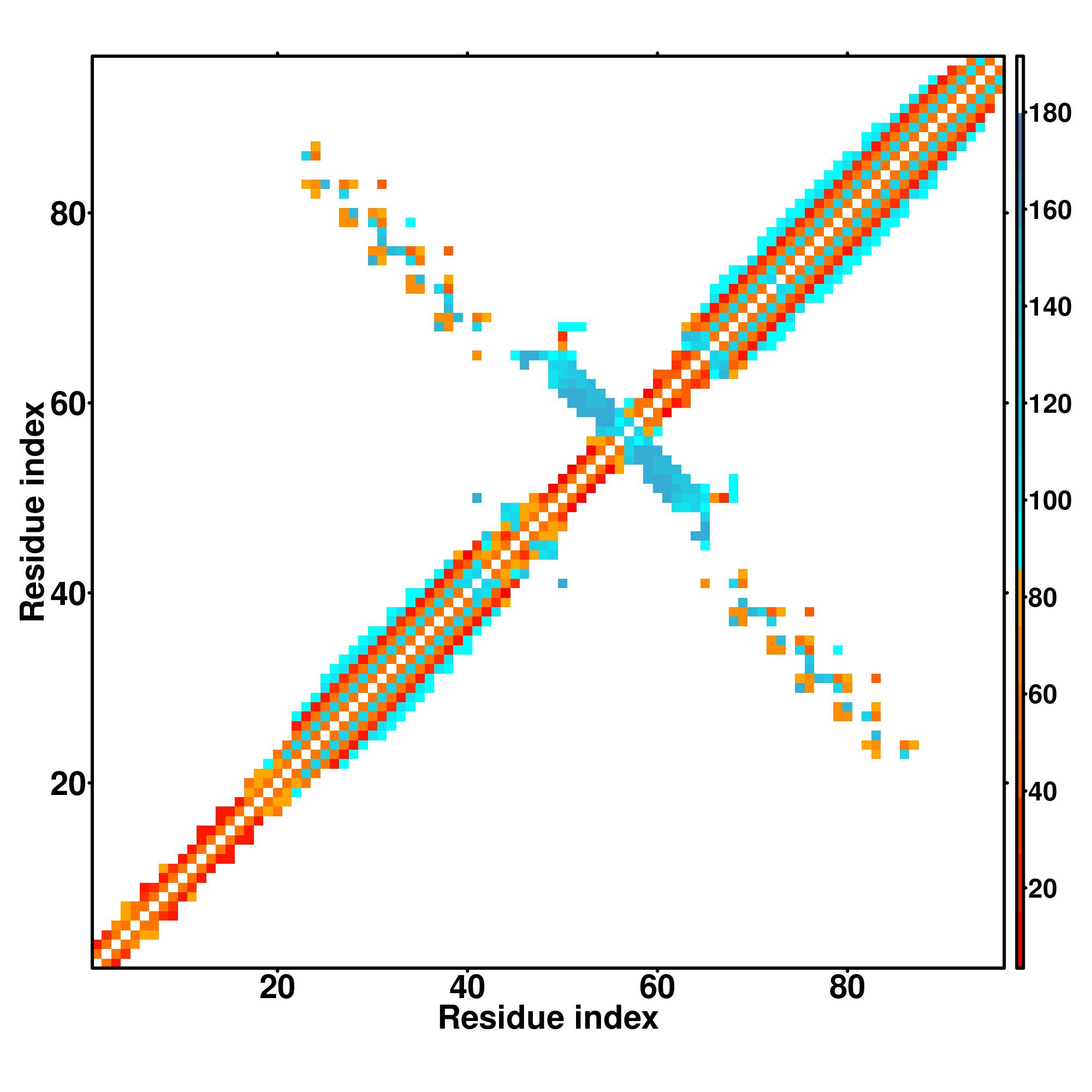 while for the distance map and hydrogen bond network, a color scale represents a distance of 1-20+ angstroms or a angle of 0-180 degree.