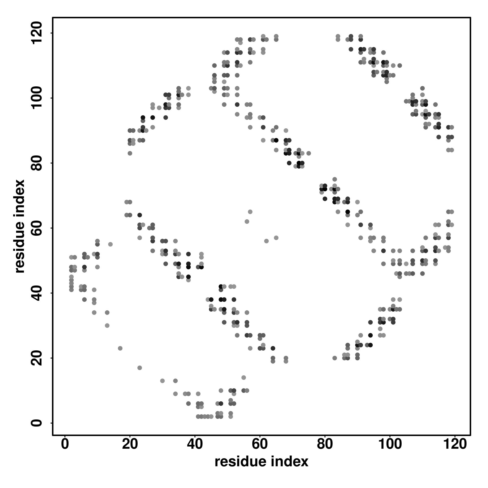For the contact map, each dot represents a residue pair with predicted contact,