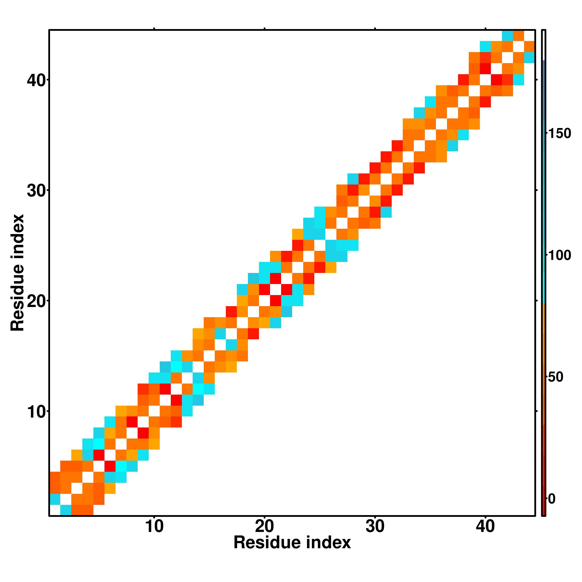 while for the distance map and hydrogen bond network, a color scale represents a distance of 1-20+ angstroms or a angle of 0-180 degree.