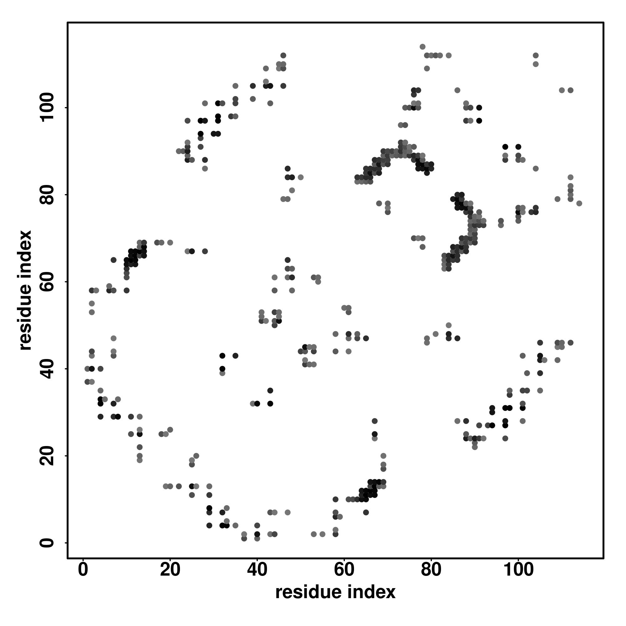 For the contact map, each dot represents a residue pair with predicted contact,