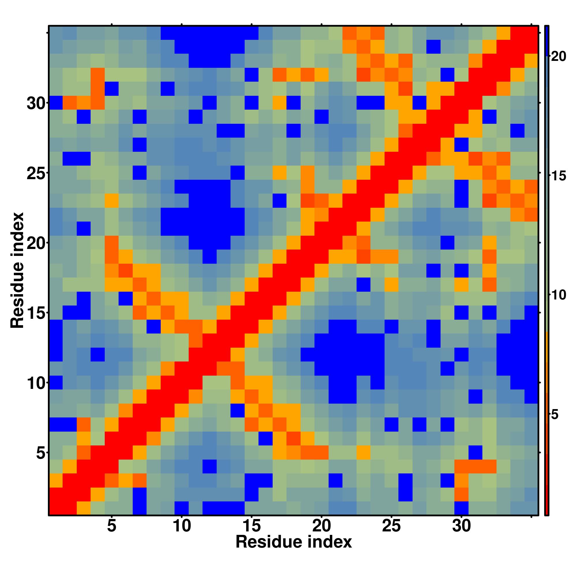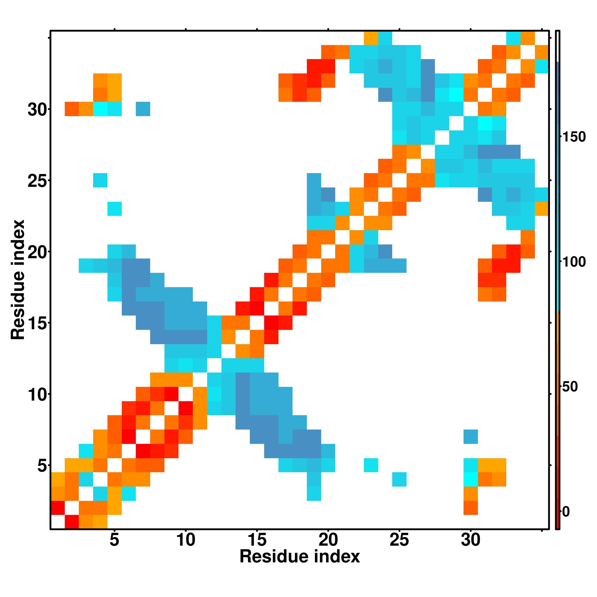 while for the distance map and hydrogen bond network, a color scale represents a distance of 1-20+ angstroms or a angle of 0-180 degree.