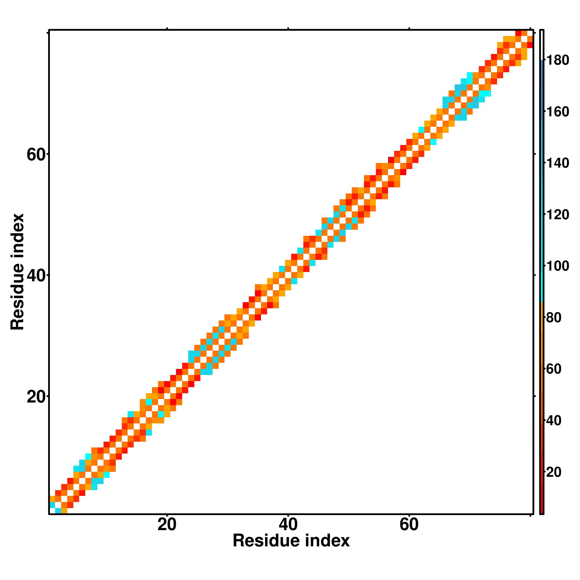 while for the distance map and hydrogen bond network, a color scale represents a distance of 1-20+ angstroms or a angle of 0-180 degree.