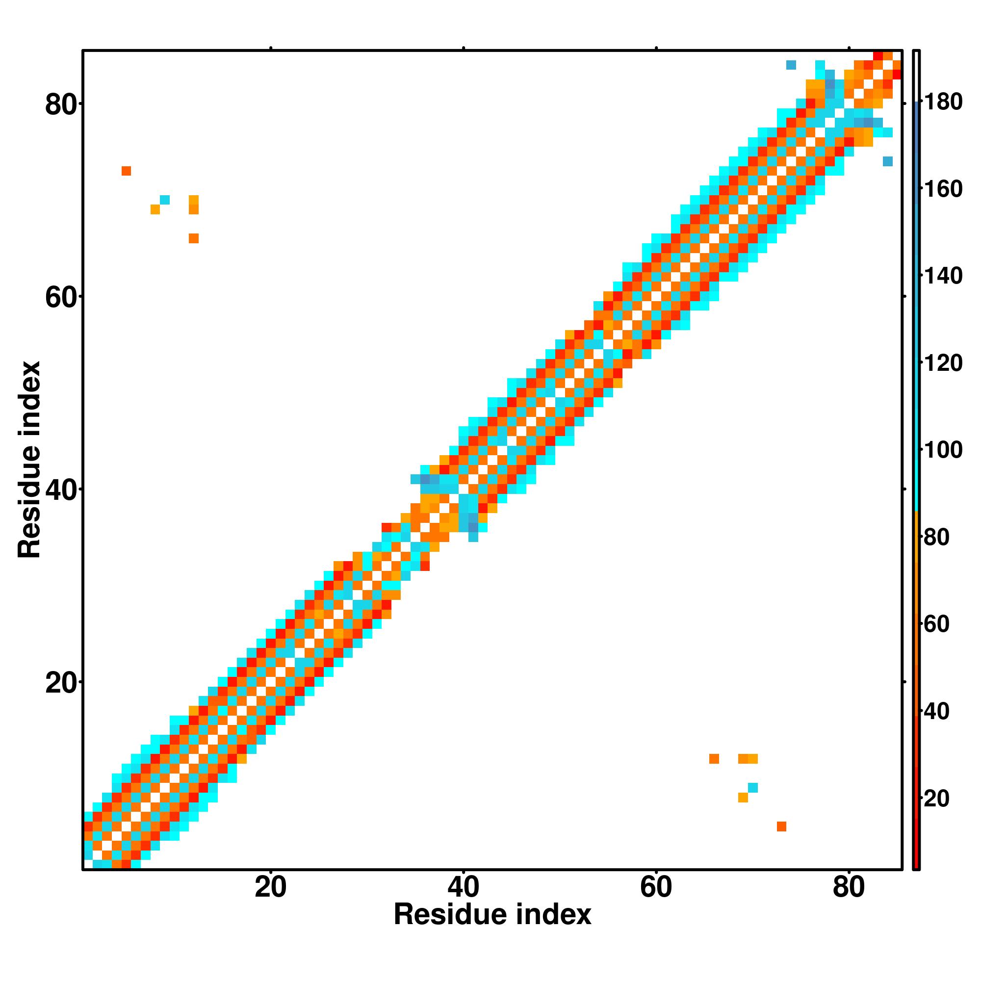while for the distance map and hydrogen bond network, a color scale represents a distance of 1-20+ angstroms or a angle of 0-180 degree.