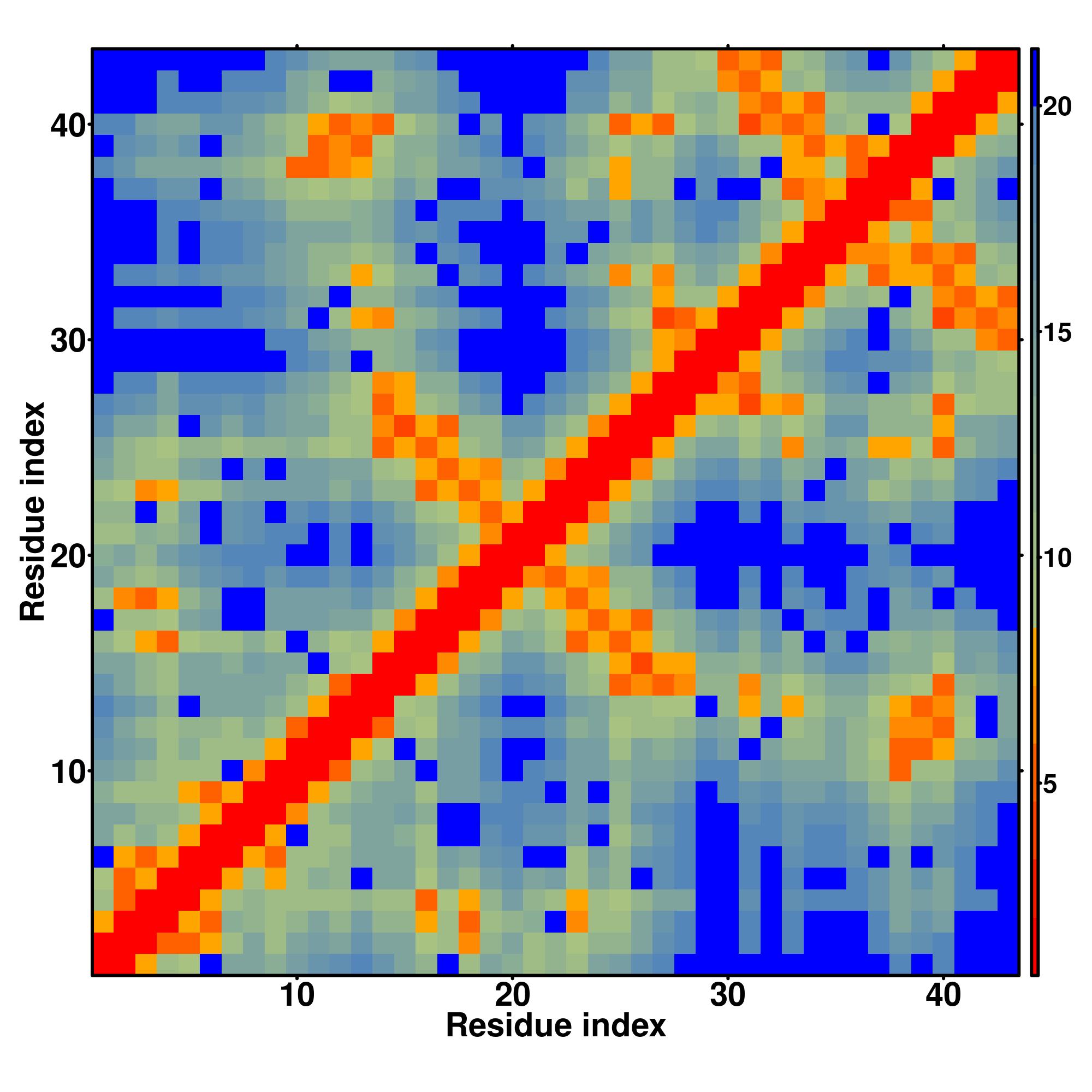 while for the distance map and hydrogen bond network, a color scale represents a distance of 1-20+ angstroms or a angle of 0-180 degree.