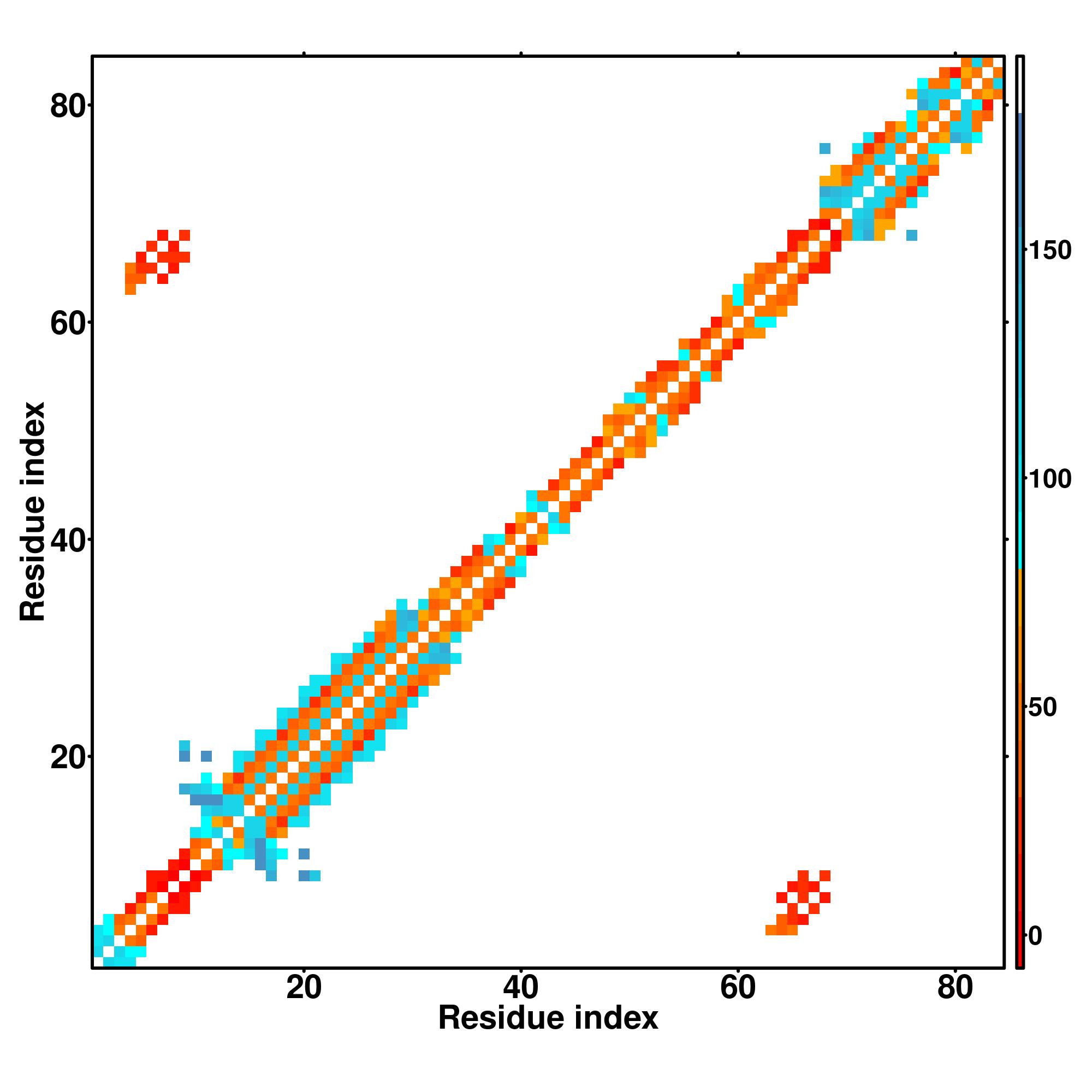 while for the distance map and hydrogen bond network, a color scale represents a distance of 1-20+ angstroms or a angle of 0-180 degree.