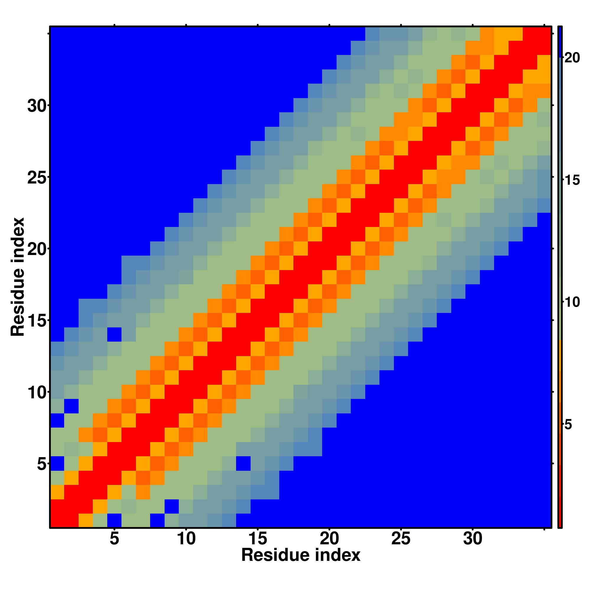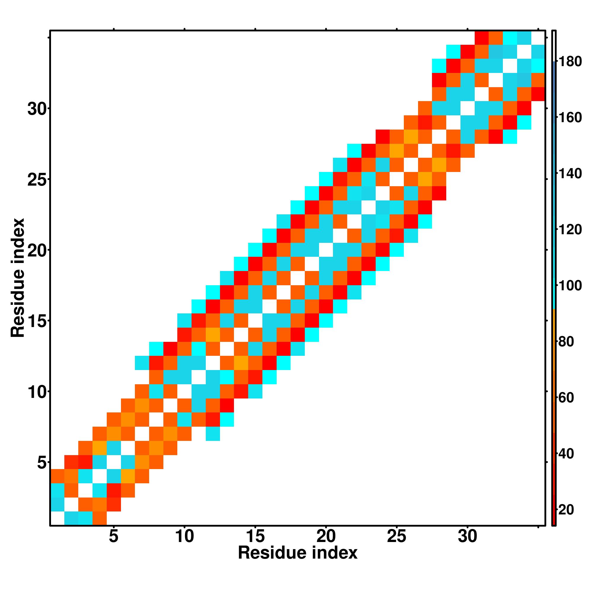 while for the distance map and hydrogen bond network, a color scale represents a distance of 1-20+ angstroms or a angle of 0-180 degree.