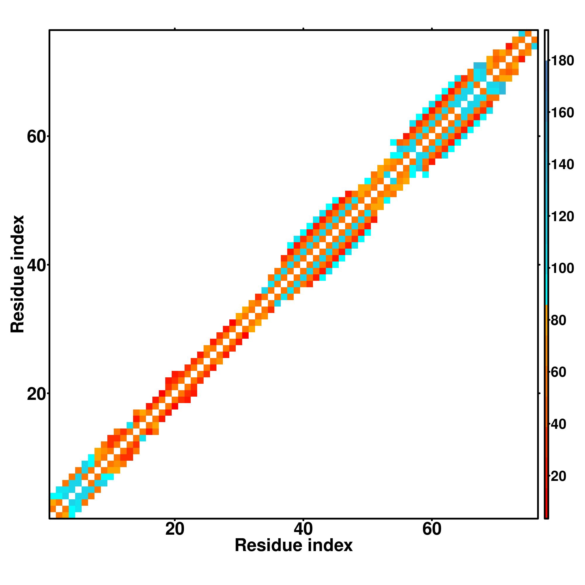 while for the distance map and hydrogen bond network, a color scale represents a distance of 1-20+ angstroms or a angle of 0-180 degree.