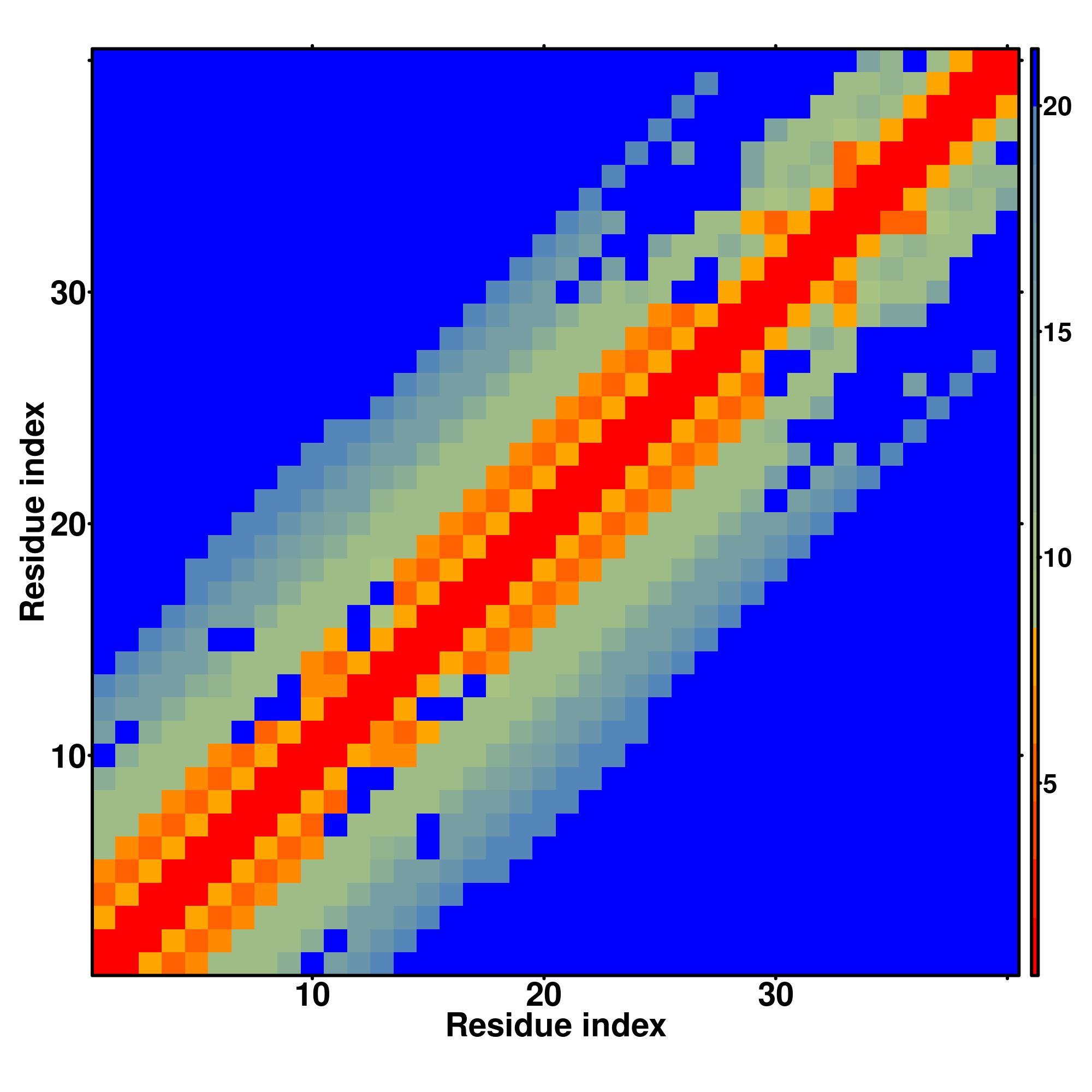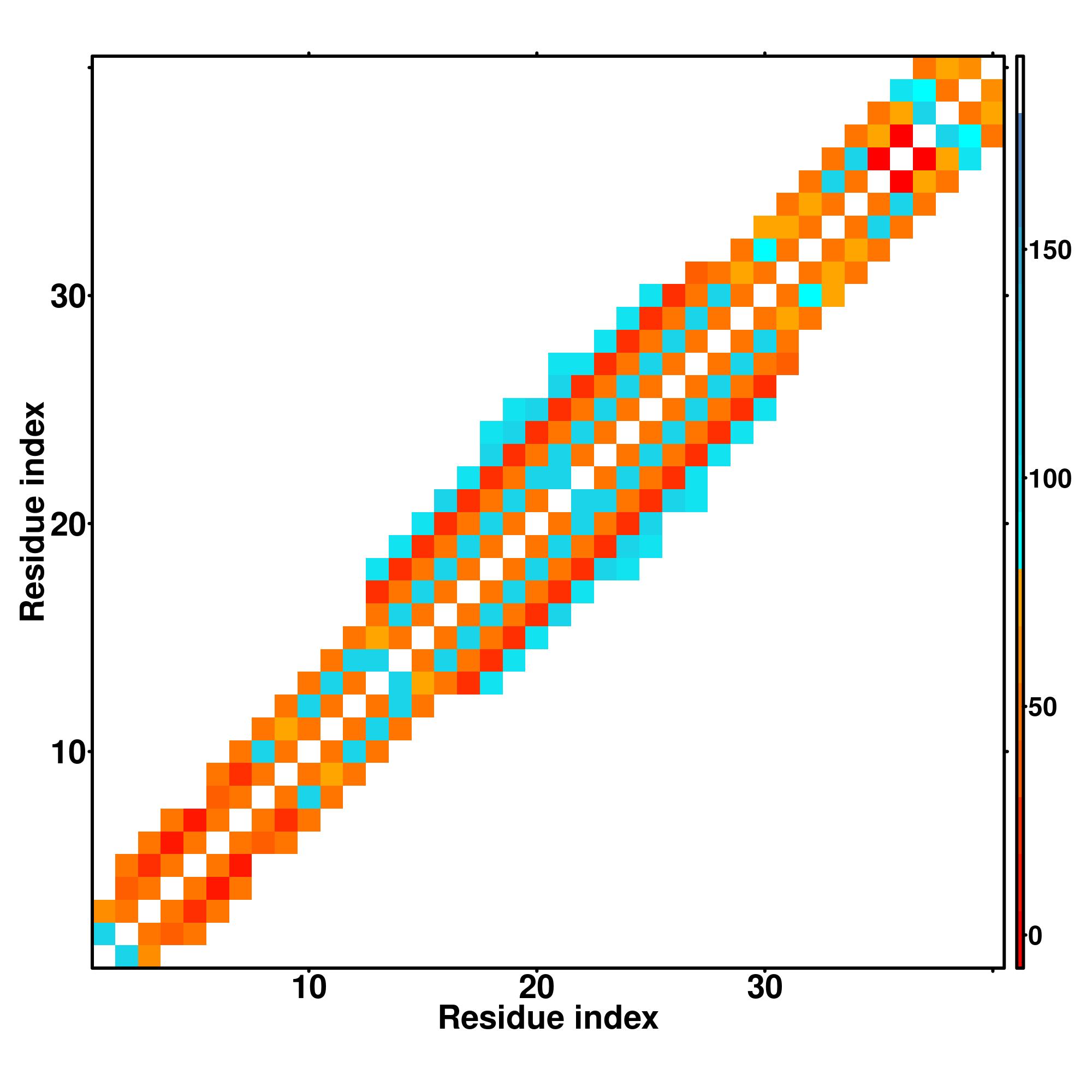 while for the distance map and hydrogen bond network, a color scale represents a distance of 1-20+ angstroms or a angle of 0-180 degree.