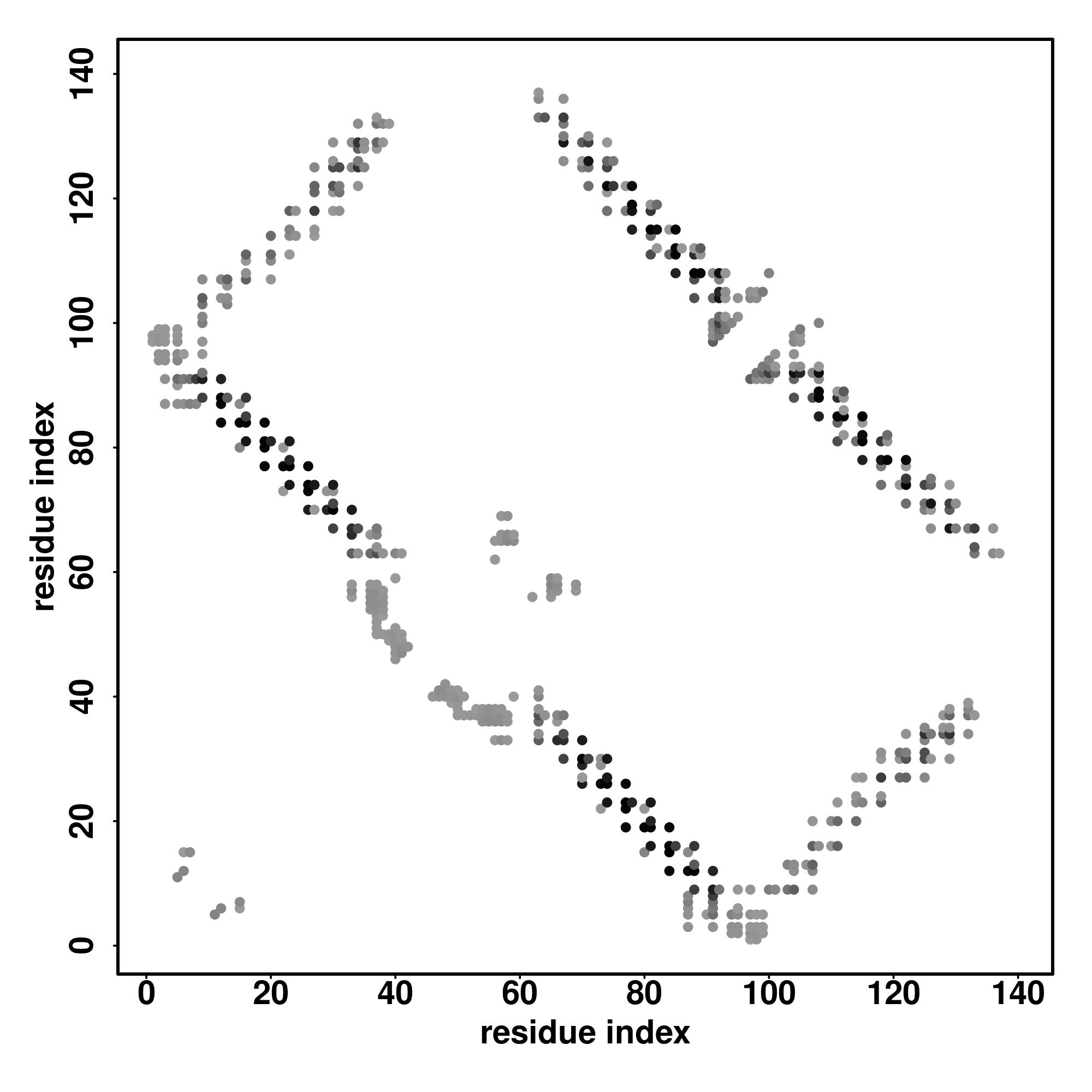 For the contact map, each dot represents a residue pair with predicted contact,