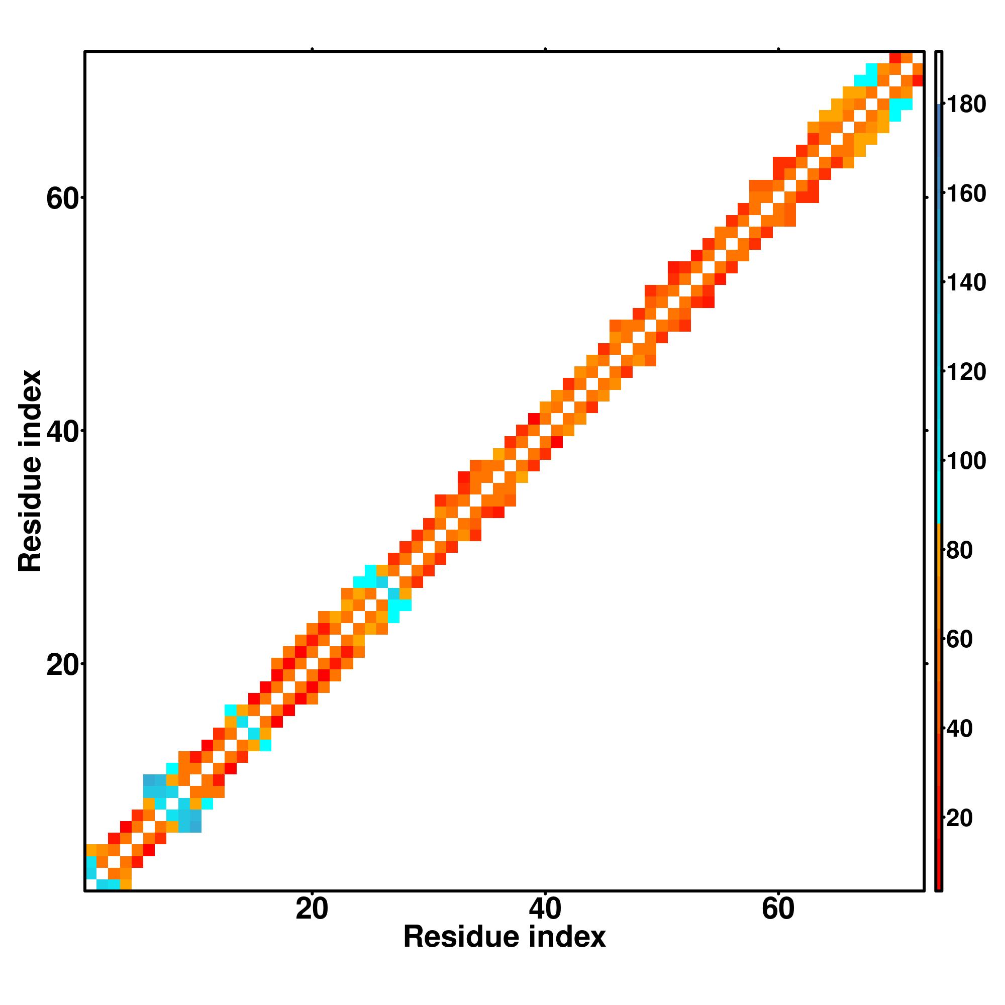 while for the distance map and hydrogen bond network, a color scale represents a distance of 1-20+ angstroms or a angle of 0-180 degree.