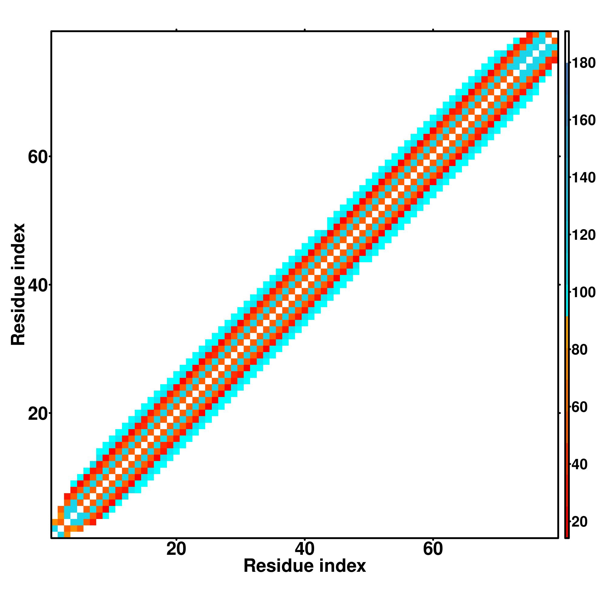 while for the distance map and hydrogen bond network, a color scale represents a distance of 1-20+ angstroms or a angle of 0-180 degree.