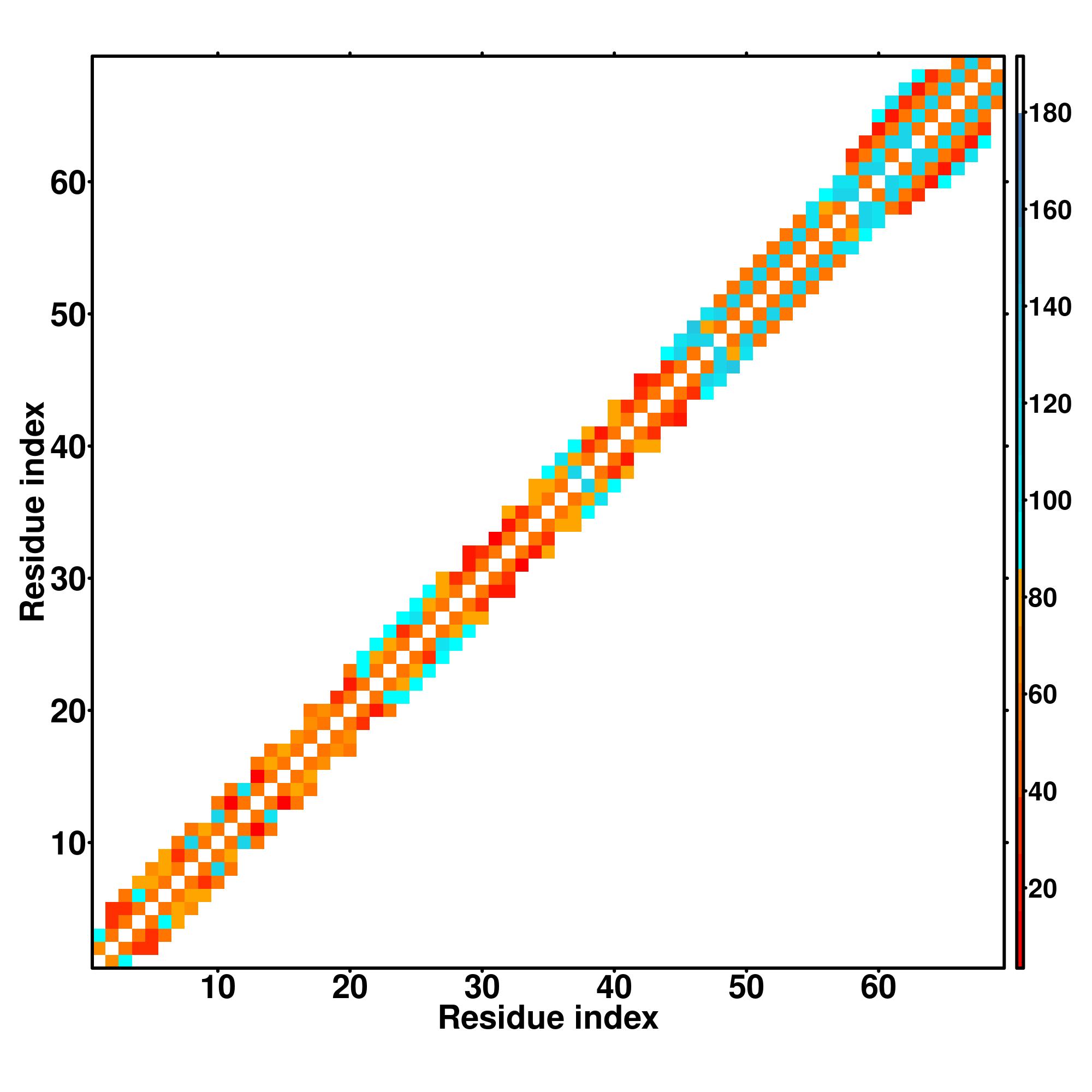 while for the distance map and hydrogen bond network, a color scale represents a distance of 1-20+ angstroms or a angle of 0-180 degree.