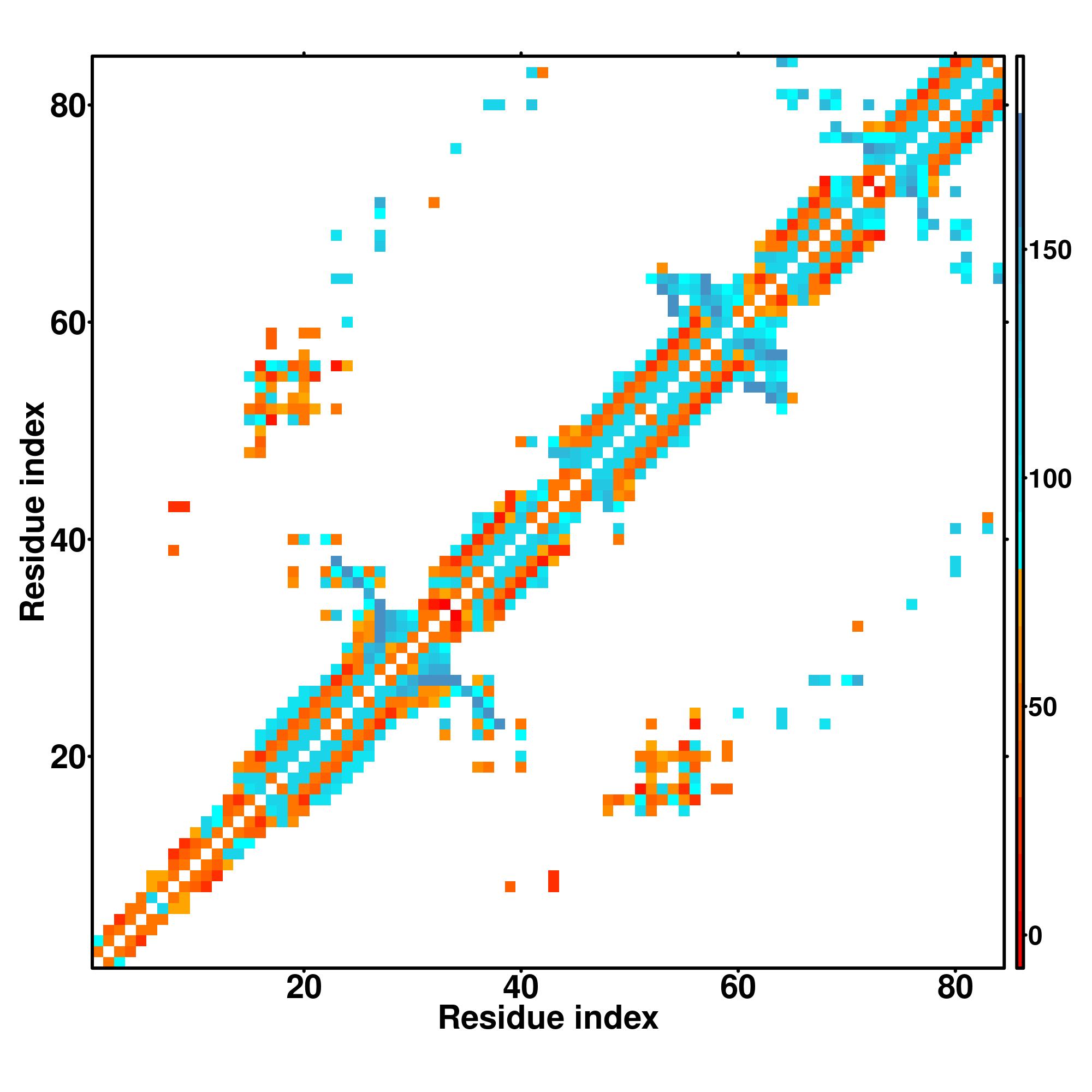 while for the distance map and hydrogen bond network, a color scale represents a distance of 1-20+ angstroms or a angle of 0-180 degree.