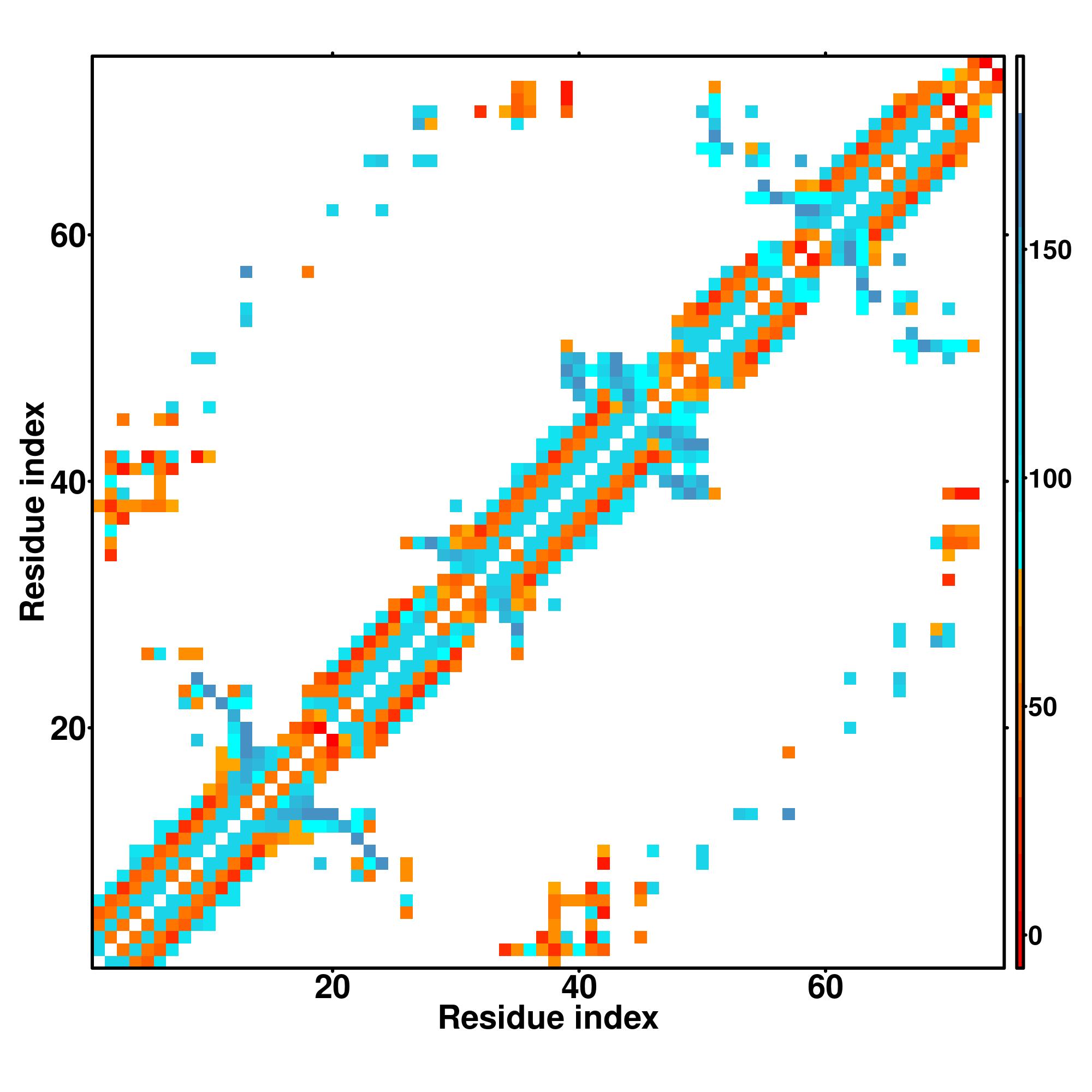 while for the distance map and hydrogen bond network, a color scale represents a distance of 1-20+ angstroms or a angle of 0-180 degree.