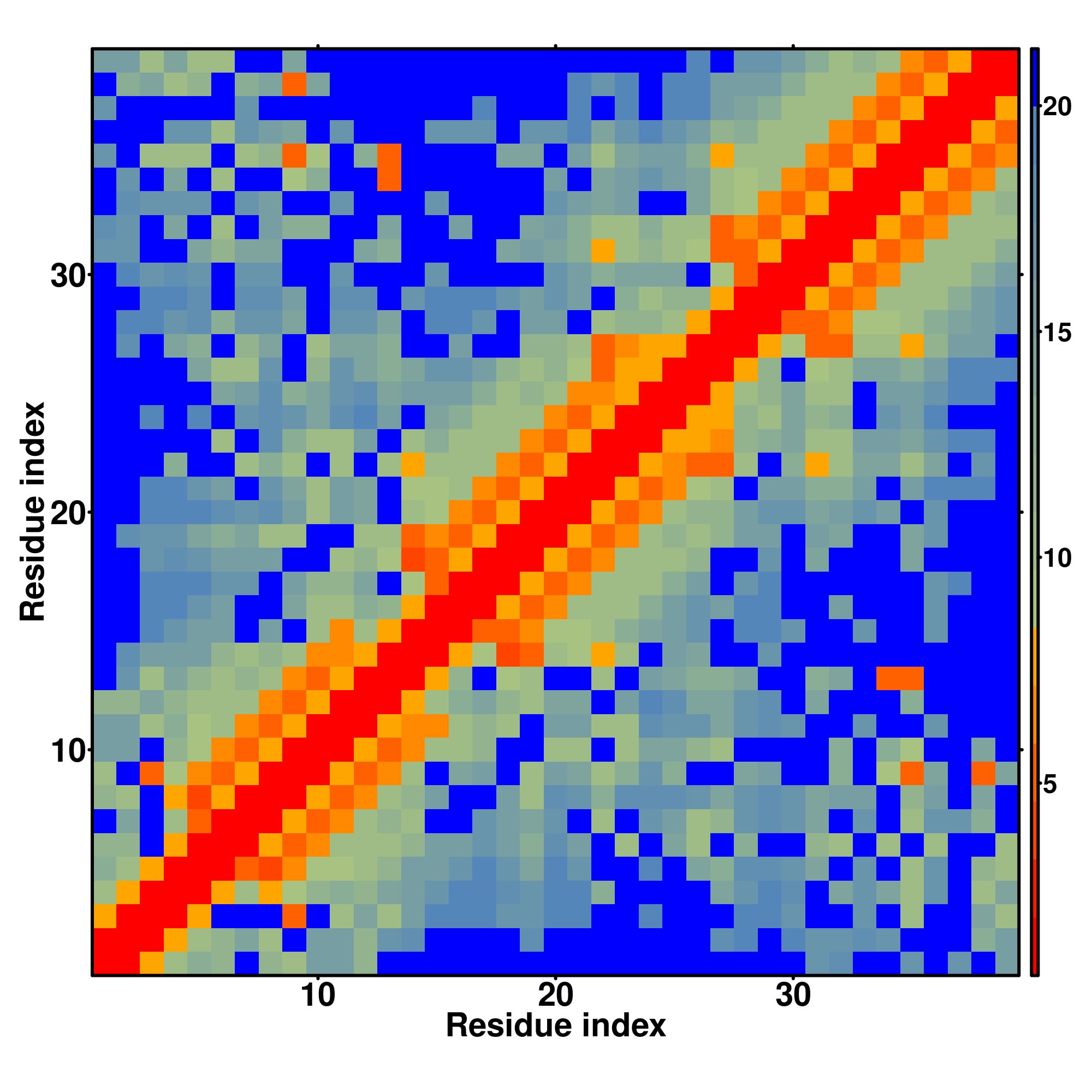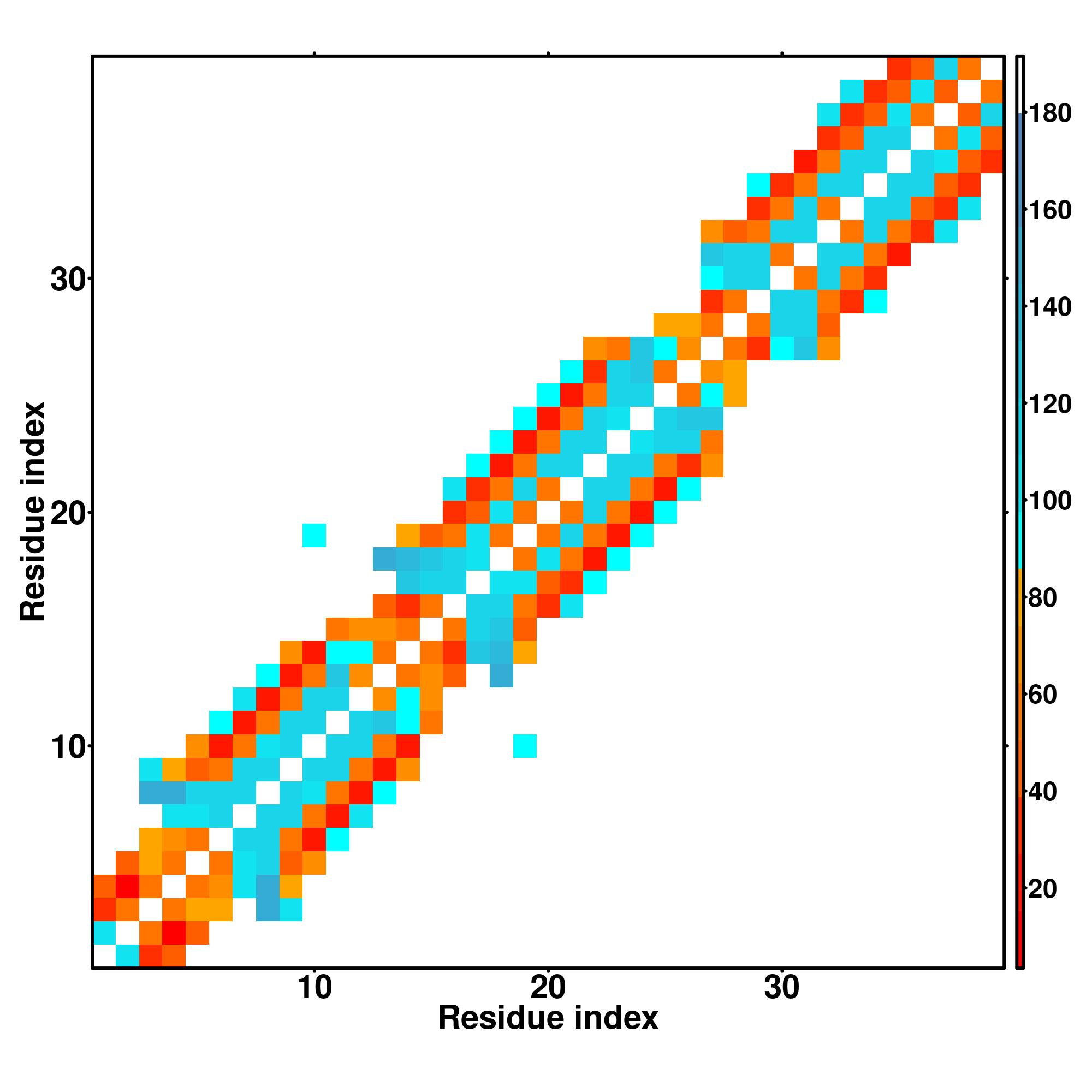 while for the distance map and hydrogen bond network, a color scale represents a distance of 1-20+ angstroms or a angle of 0-180 degree.