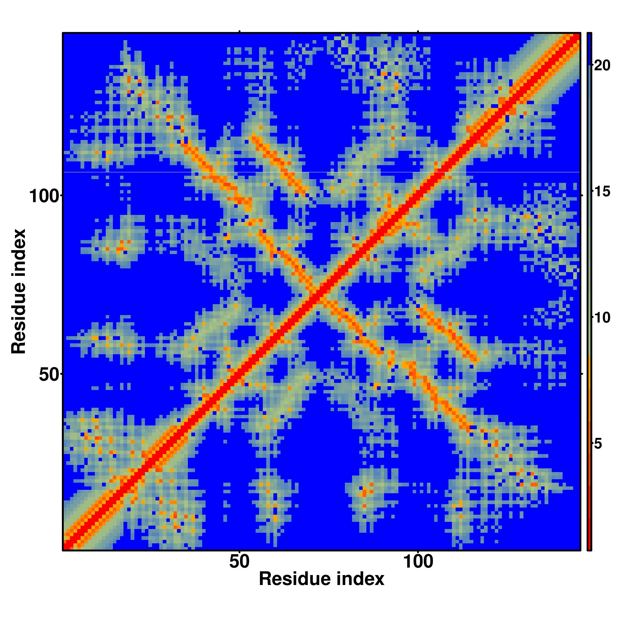 In the contact, distance map and hydrogen bond networks, the axes mark the residue index along the sequence.