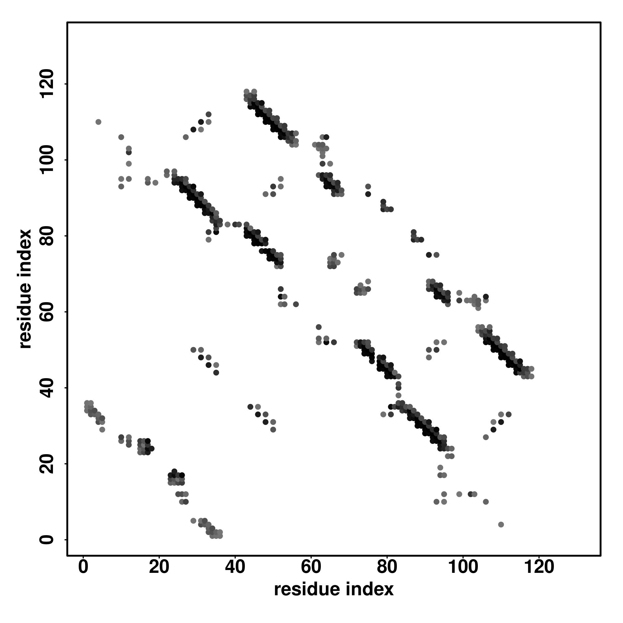 For the contact map, each dot represents a residue pair with predicted contact,