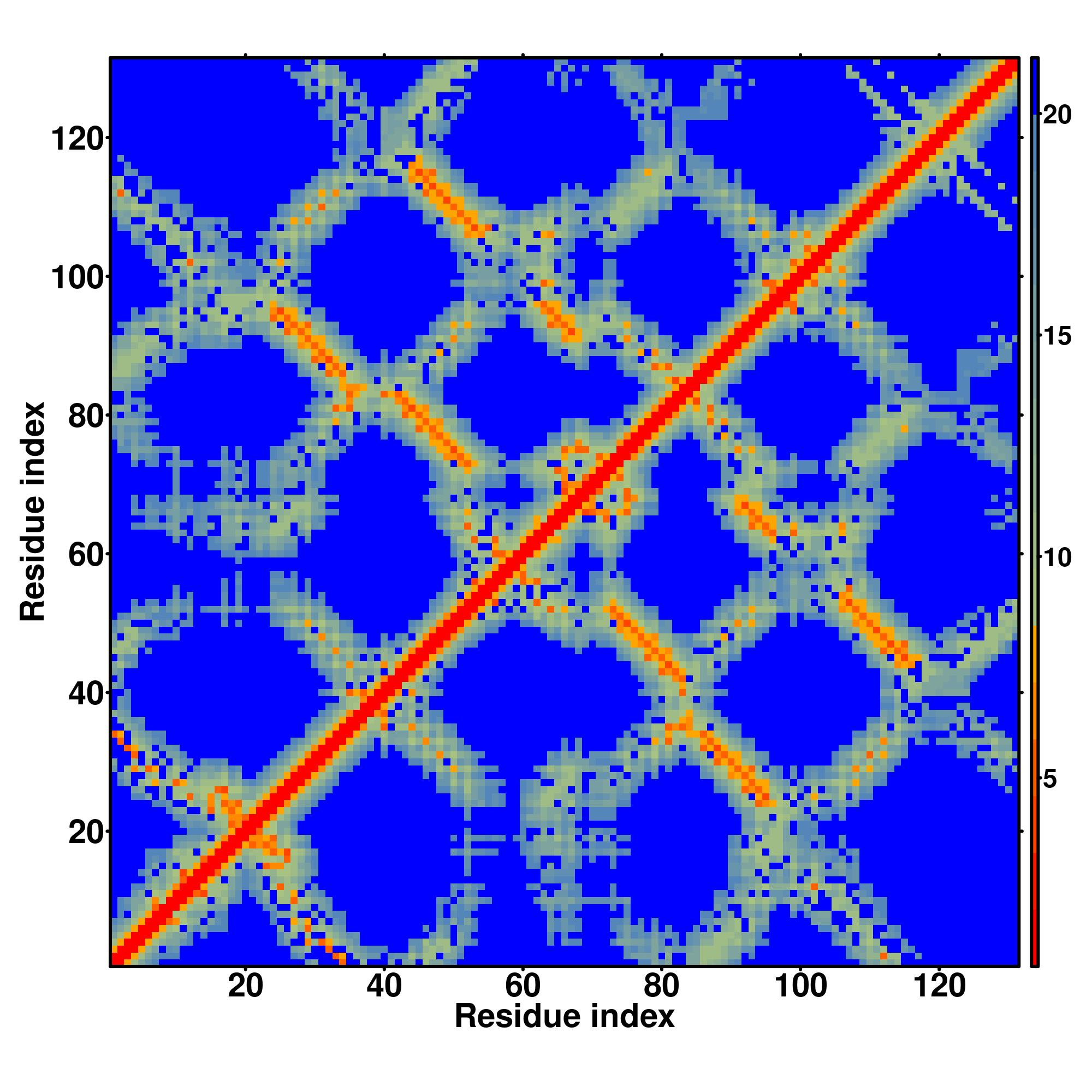 In the contact, distance map and hydrogen bond networks, the axes mark the residue index along the sequence.