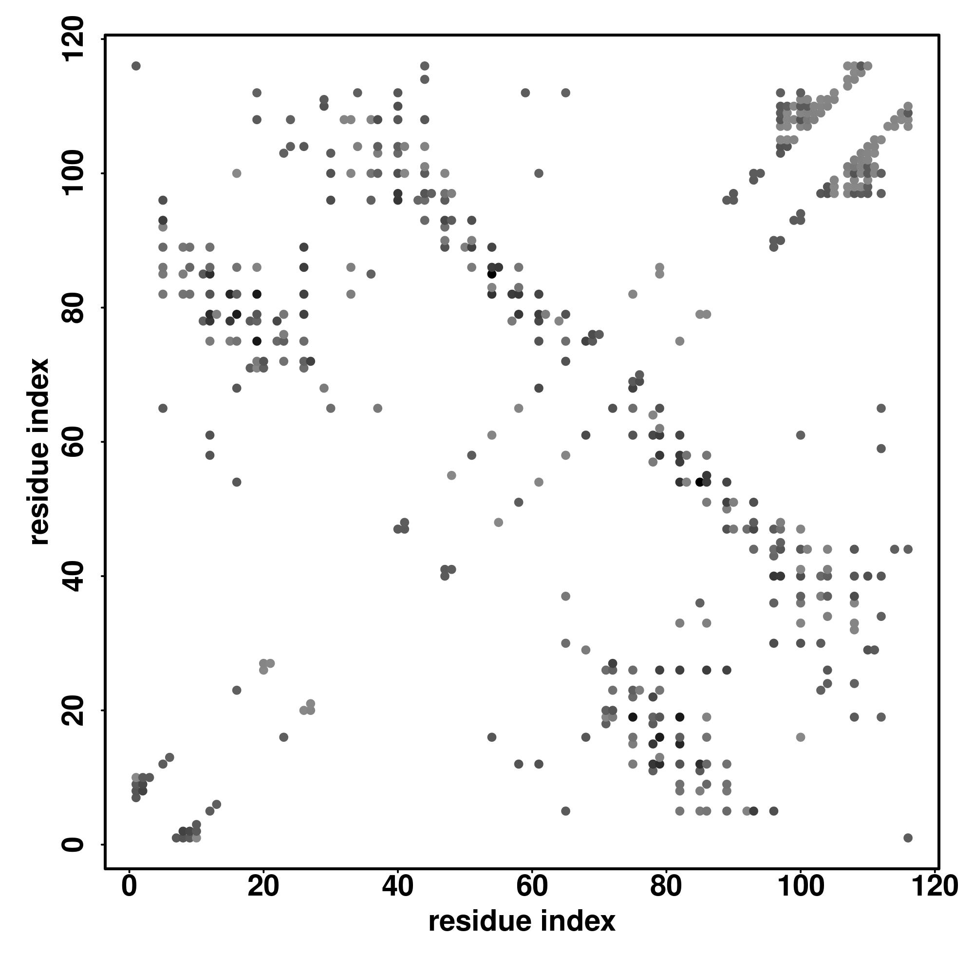 For the contact map, each dot represents a residue pair with predicted contact,