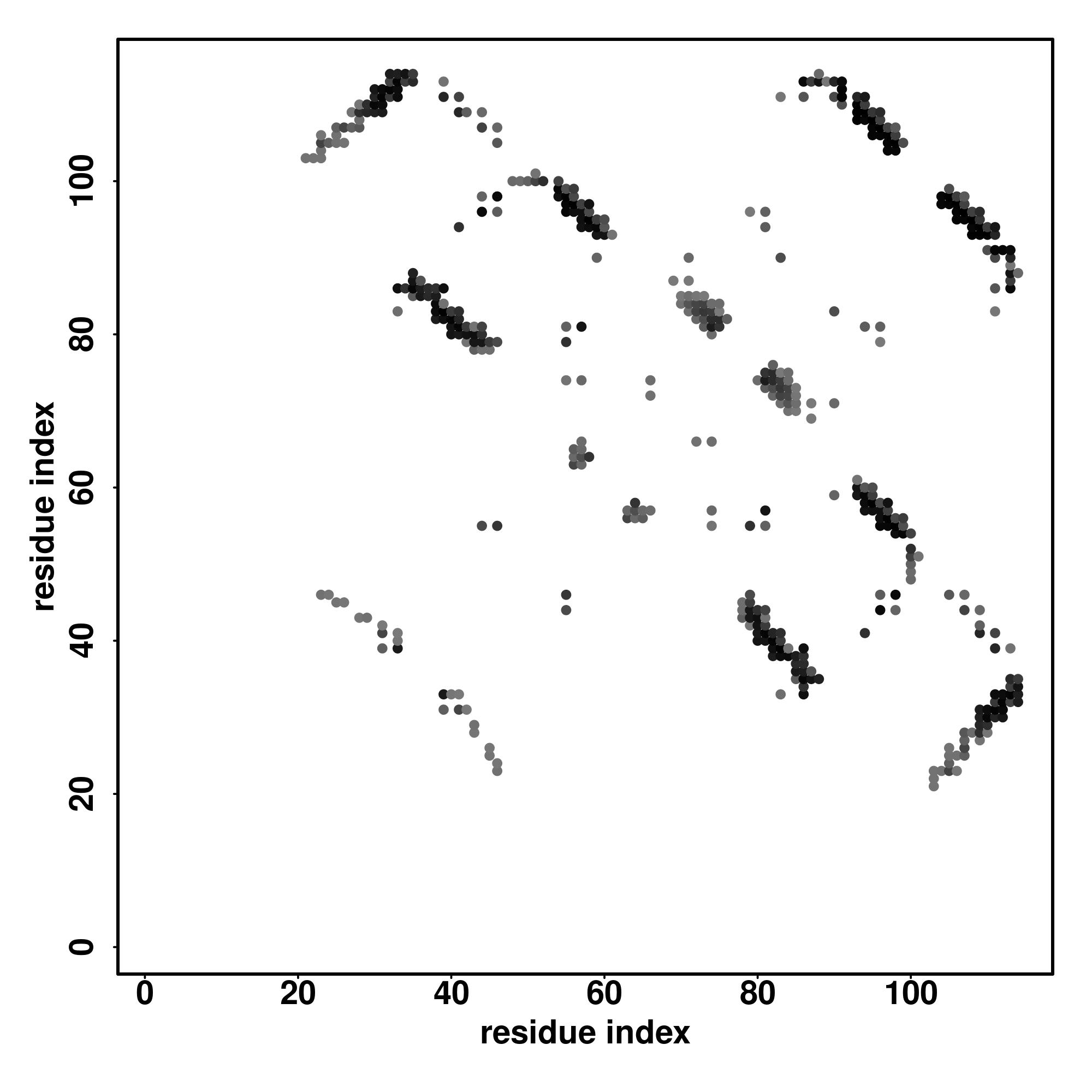 For the contact map, each dot represents a residue pair with predicted contact,