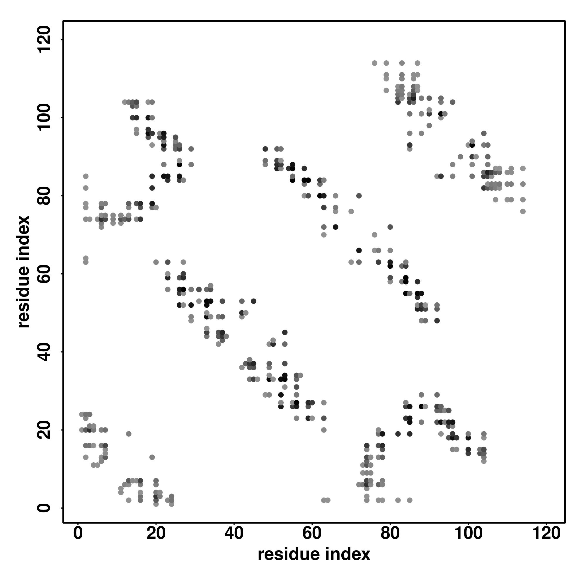 For the contact map, each dot represents a residue pair with predicted contact,