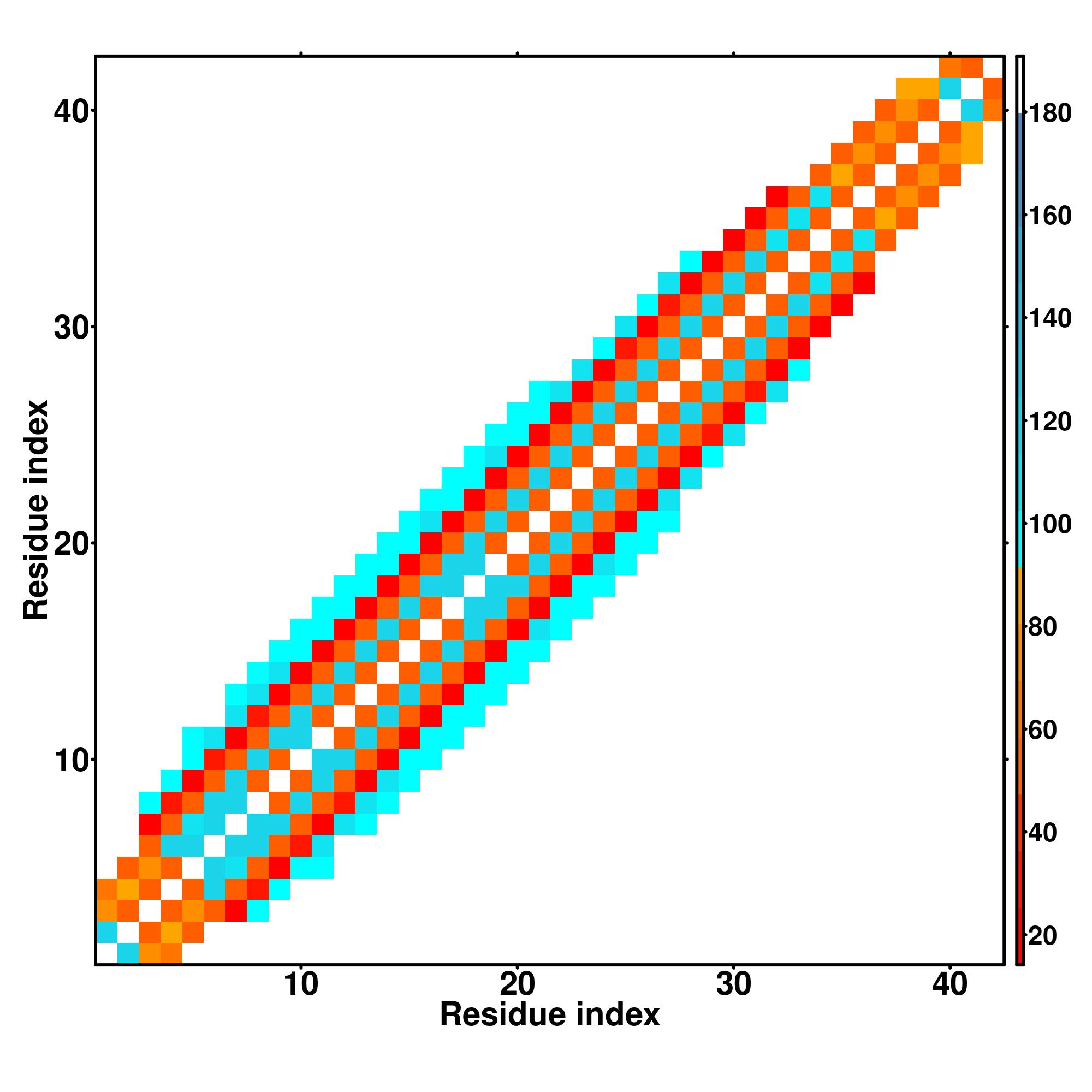 while for the distance map and hydrogen bond network, a color scale represents a distance of 1-20+ angstroms or a angle of 0-180 degree.
