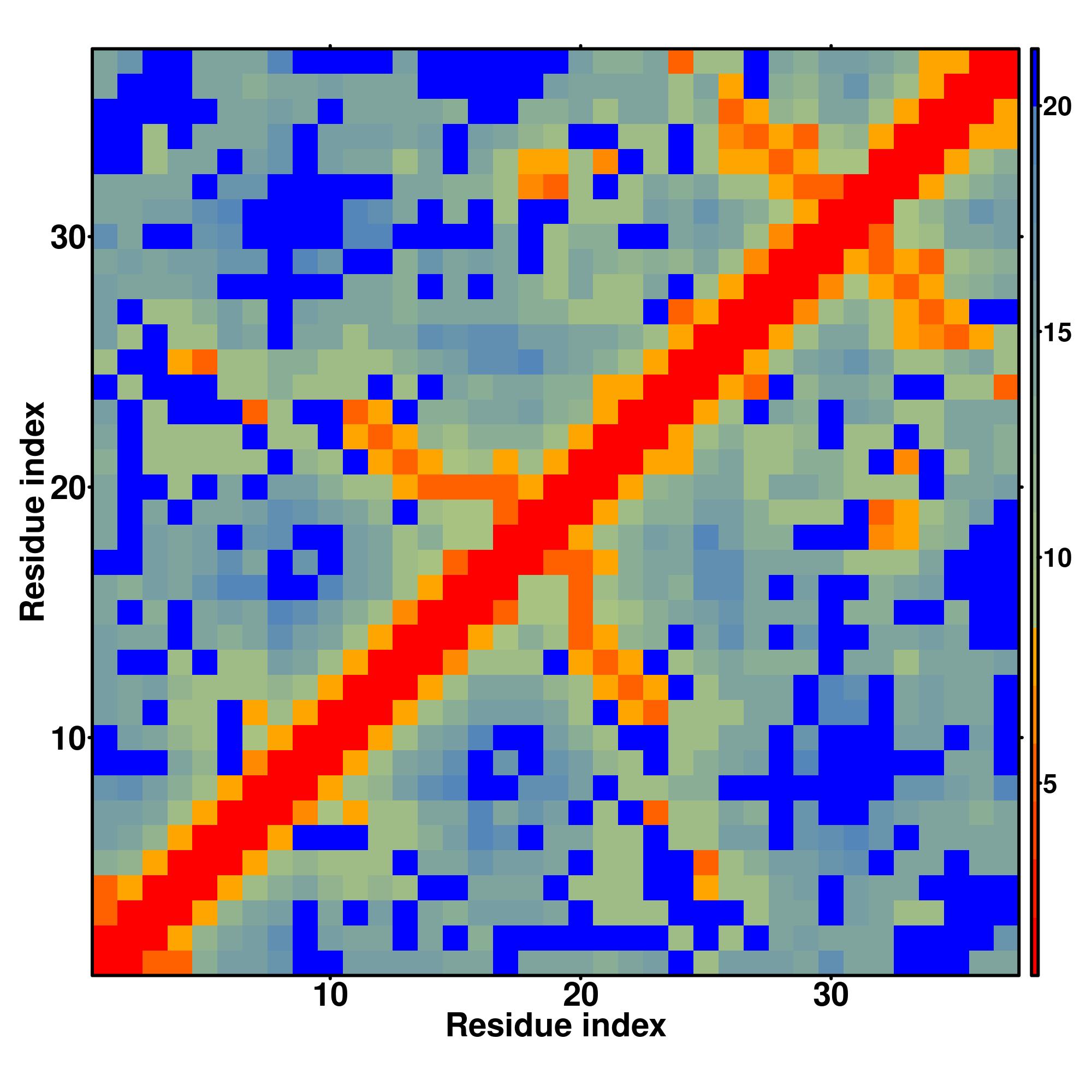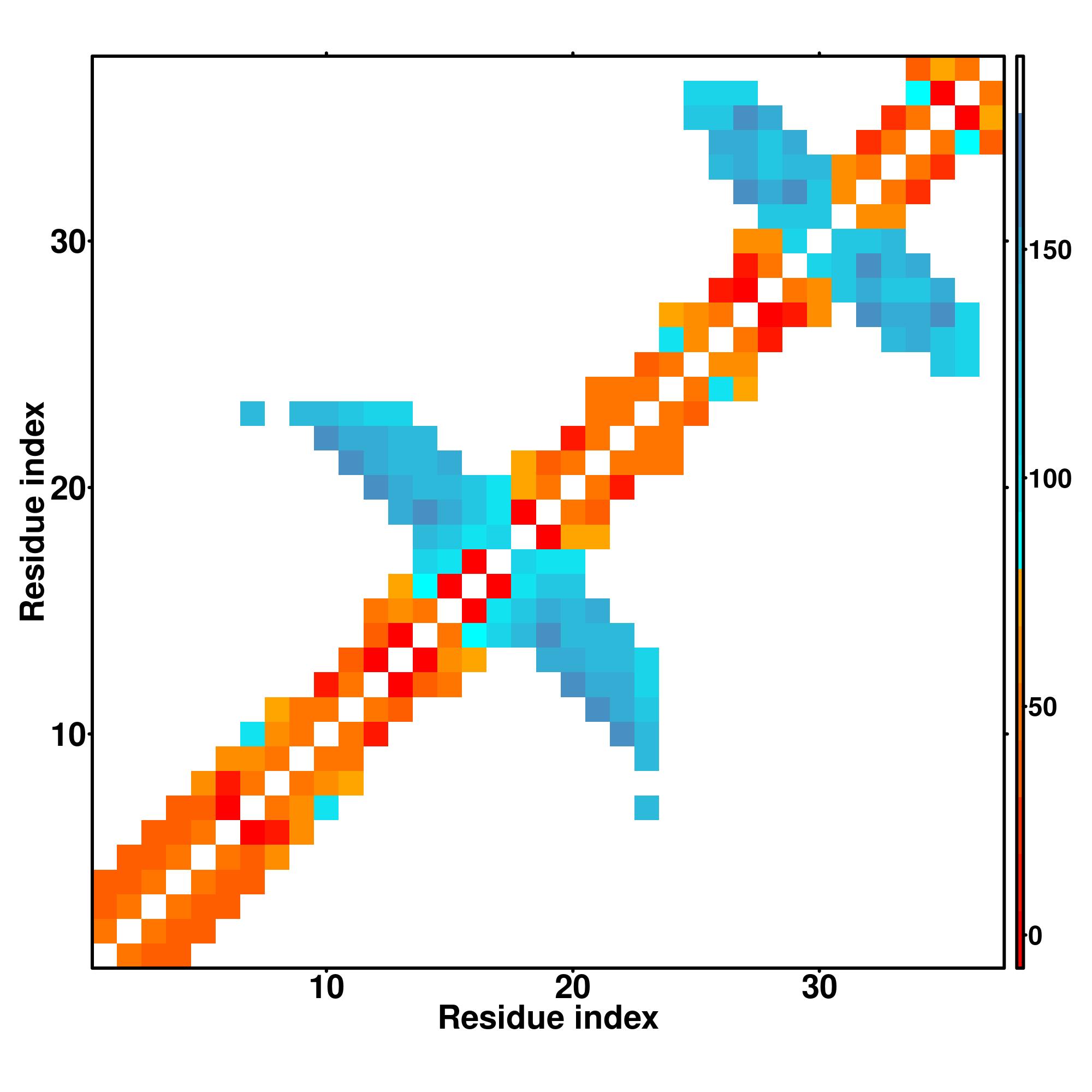 while for the distance map and hydrogen bond network, a color scale represents a distance of 1-20+ angstroms or a angle of 0-180 degree.