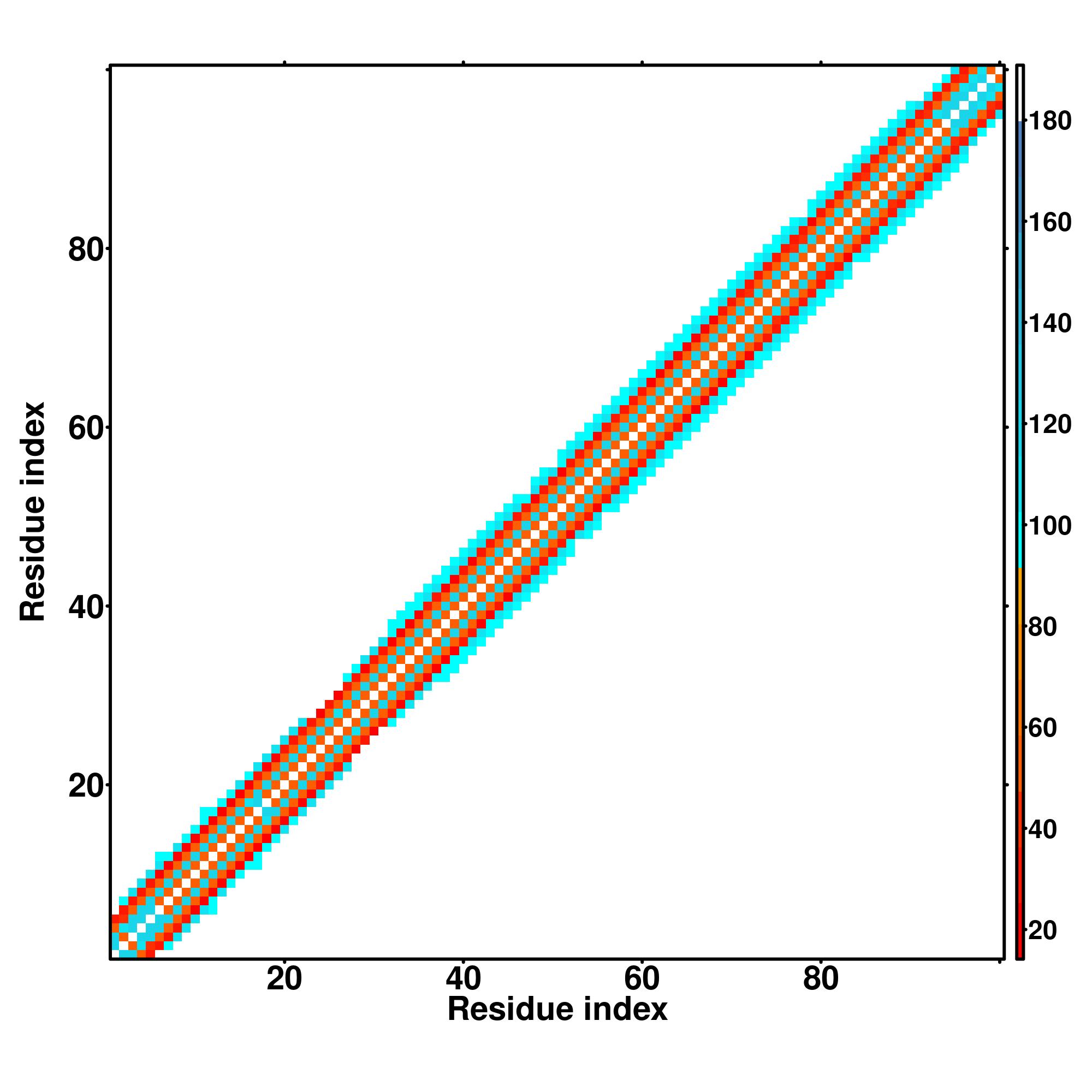 while for the distance map and hydrogen bond network, a color scale represents a distance of 1-20+ angstroms or a angle of 0-180 degree.