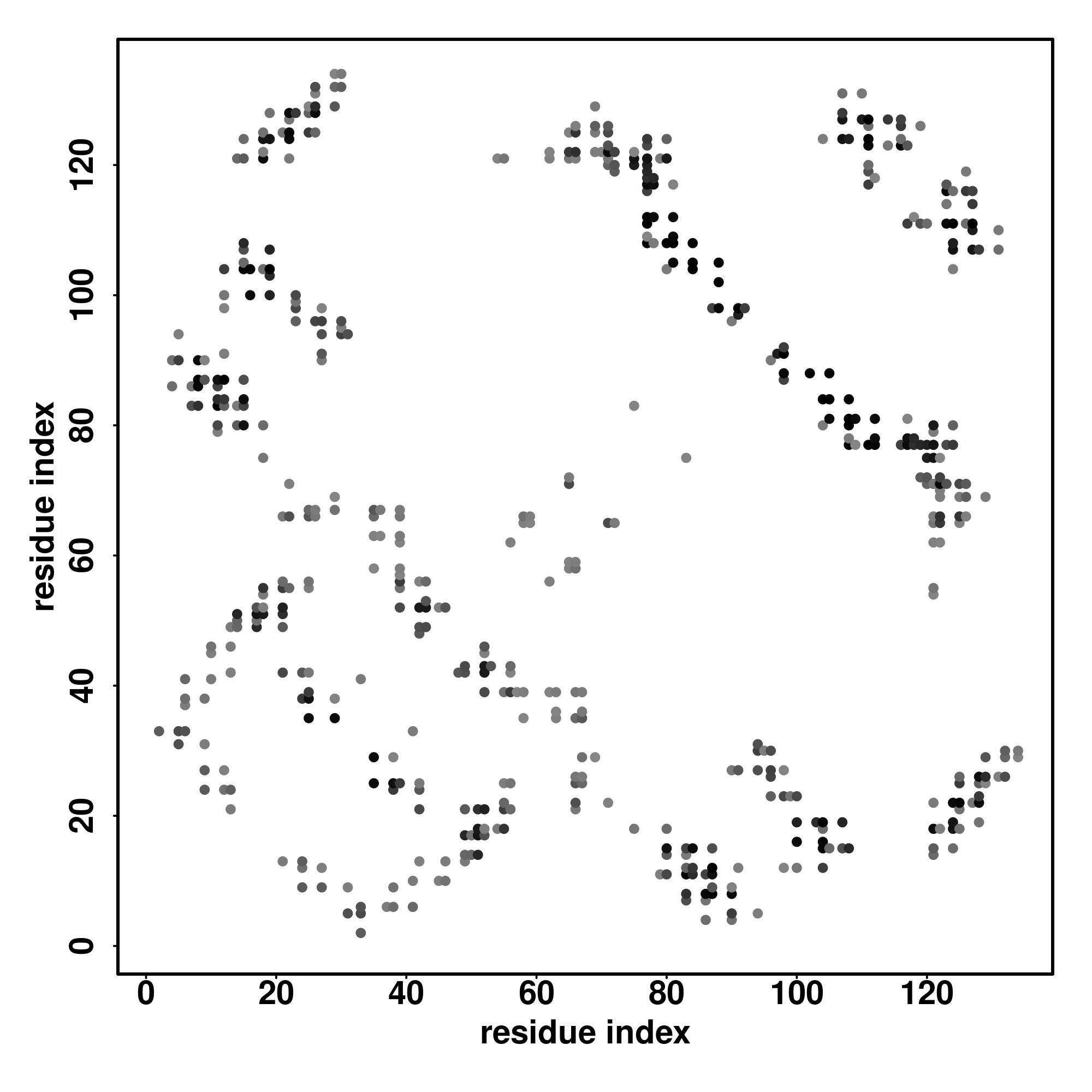 For the contact map, each dot represents a residue pair with predicted contact,