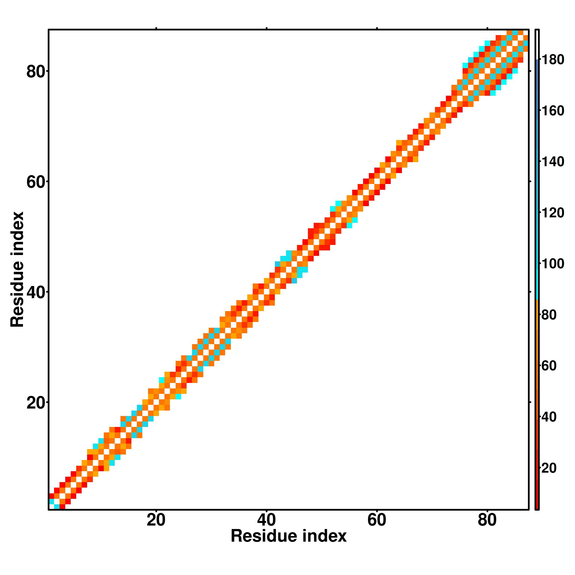 while for the distance map and hydrogen bond network, a color scale represents a distance of 1-20+ angstroms or a angle of 0-180 degree.