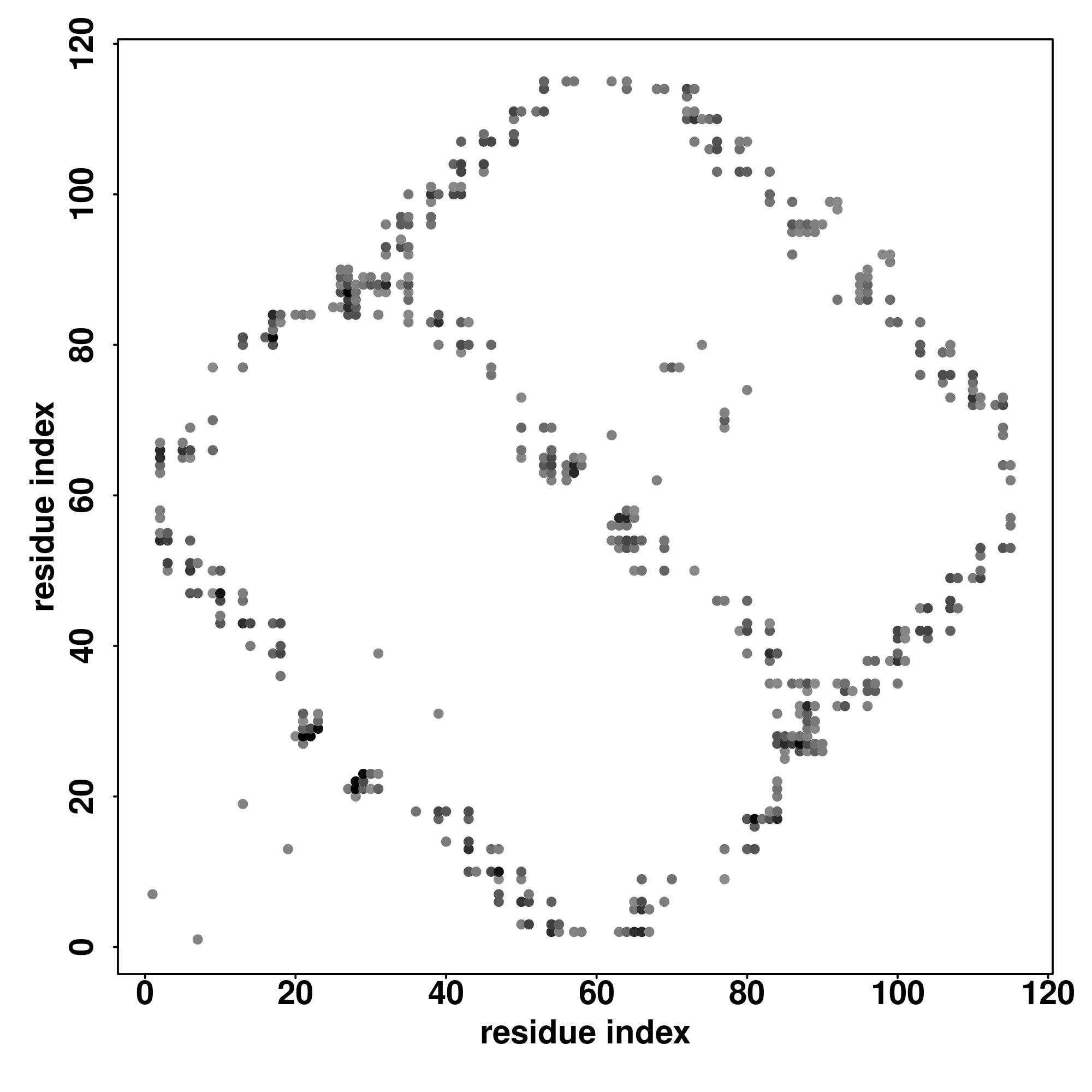 For the contact map, each dot represents a residue pair with predicted contact,