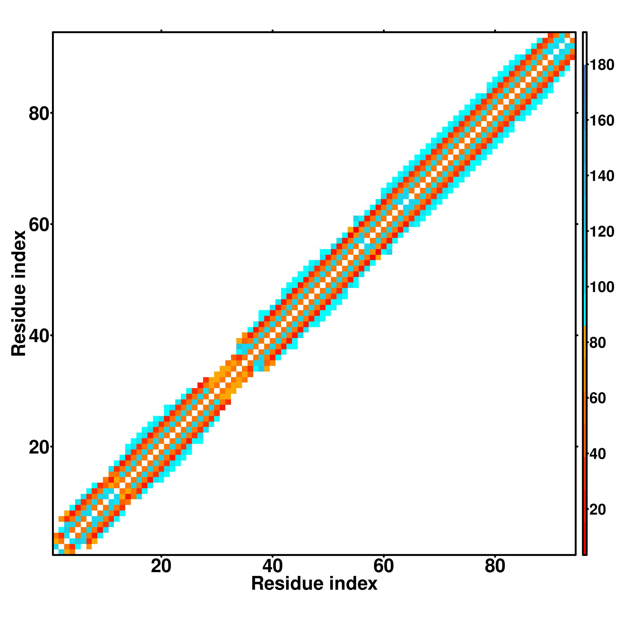 while for the distance map and hydrogen bond network, a color scale represents a distance of 1-20+ angstroms or a angle of 0-180 degree.
