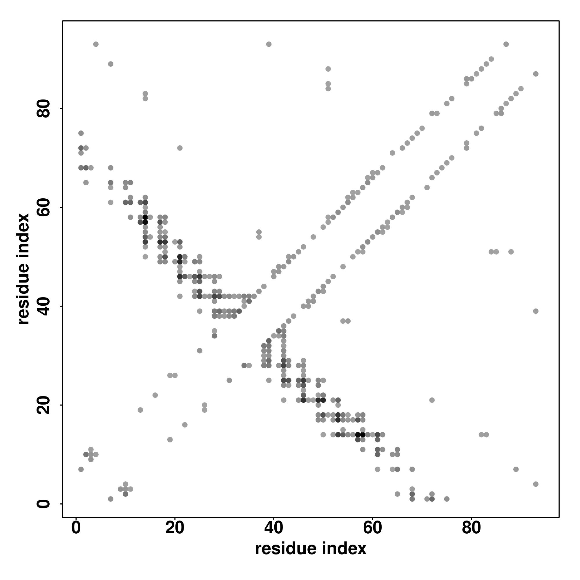 For the contact map, each dot represents a residue pair with predicted contact,
