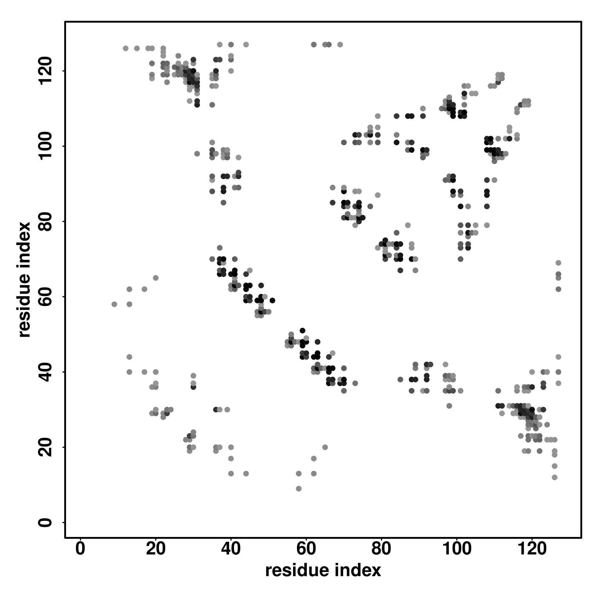 For the contact map, each dot represents a residue pair with predicted contact,