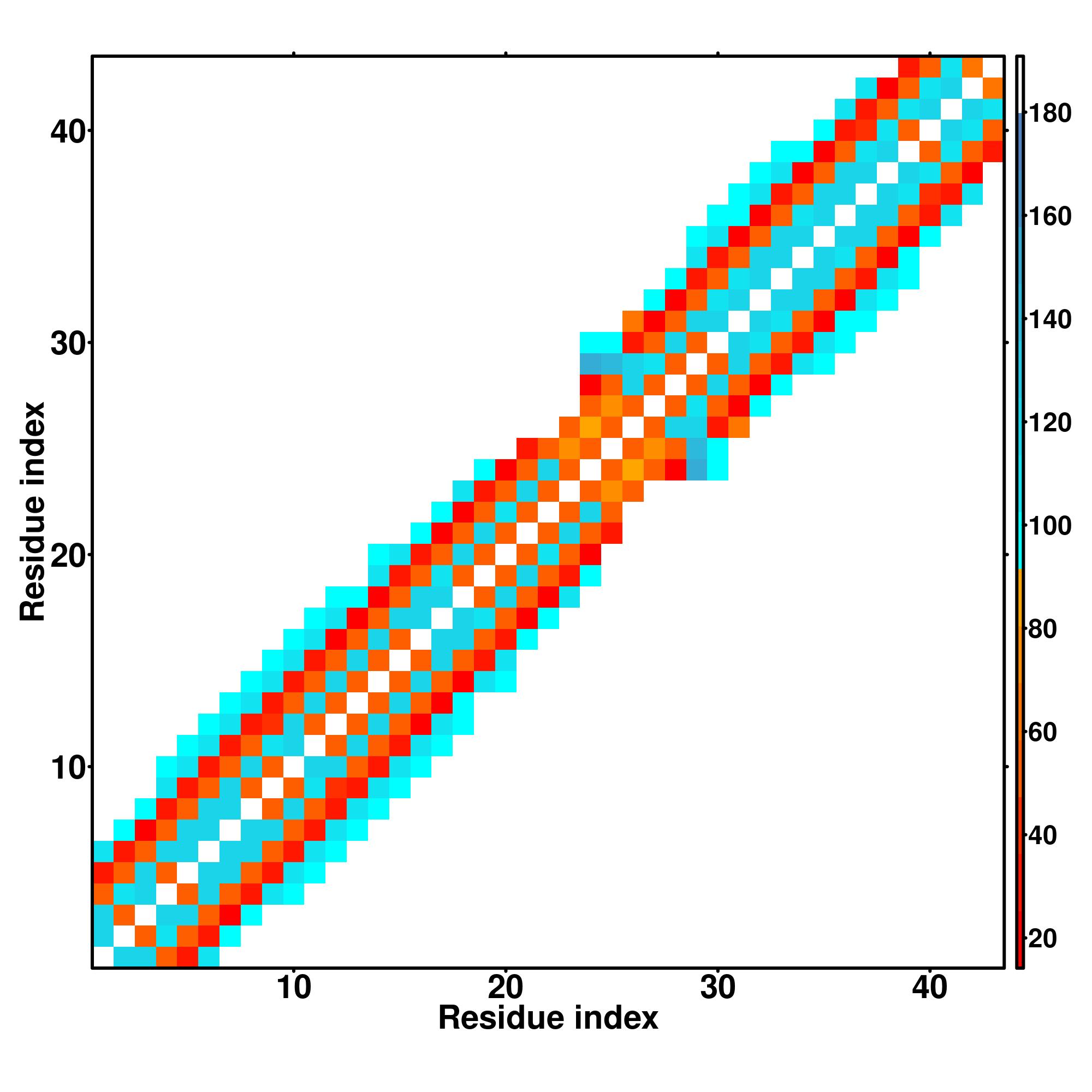 while for the distance map and hydrogen bond network, a color scale represents a distance of 1-20+ angstroms or a angle of 0-180 degree.