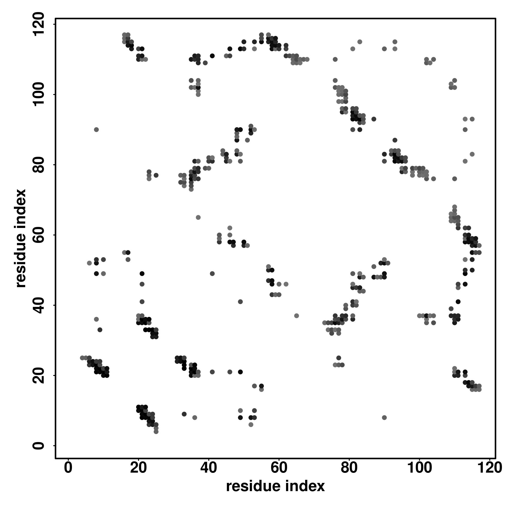For the contact map, each dot represents a residue pair with predicted contact,