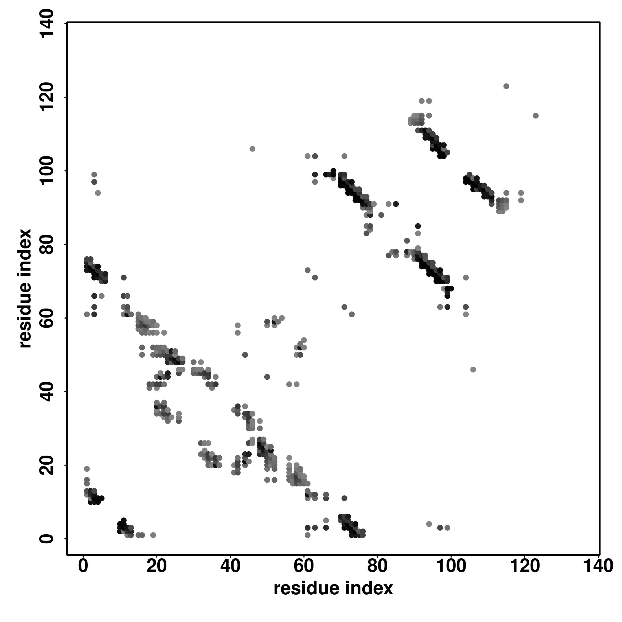 For the contact map, each dot represents a residue pair with predicted contact,