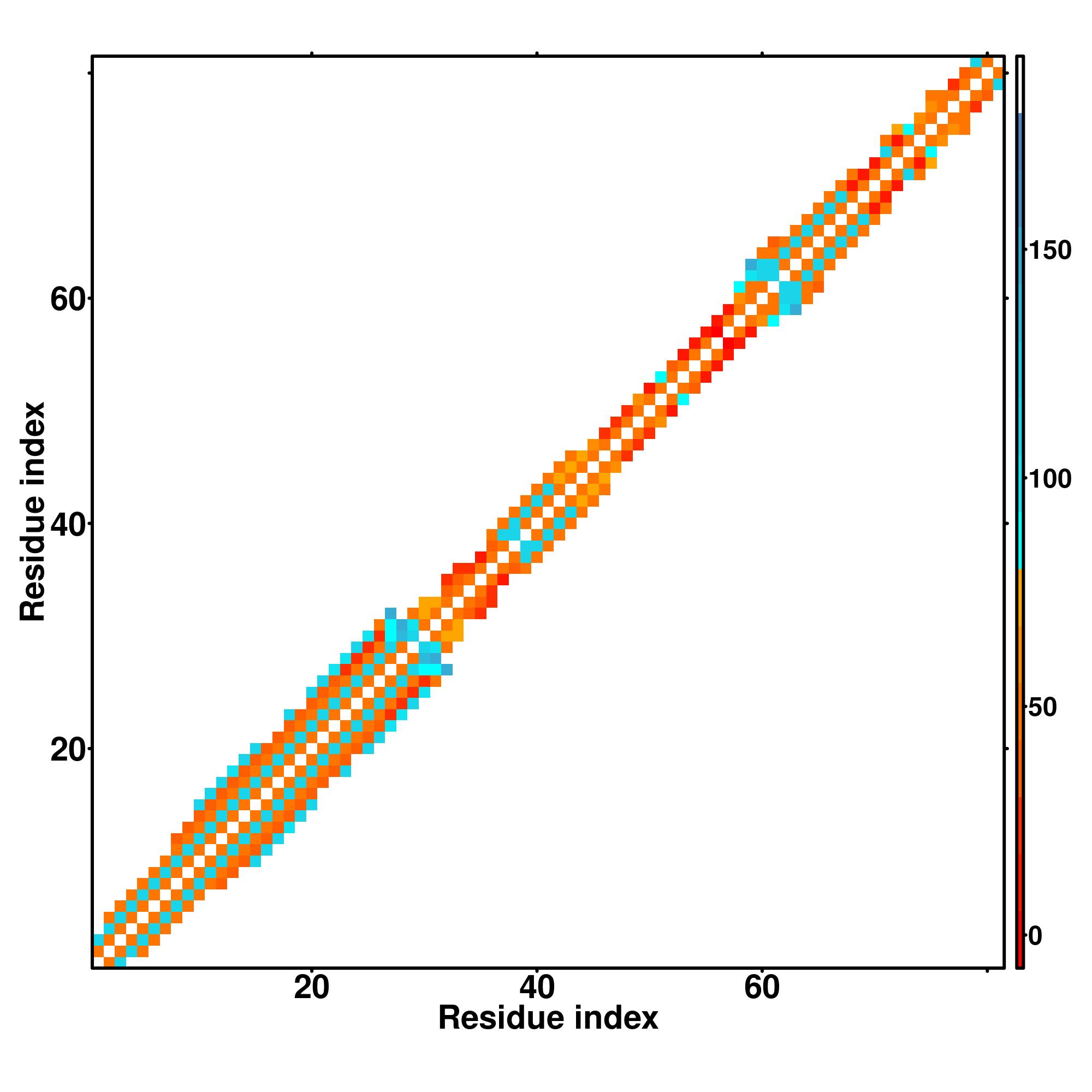 while for the distance map and hydrogen bond network, a color scale represents a distance of 1-20+ angstroms or a angle of 0-180 degree.