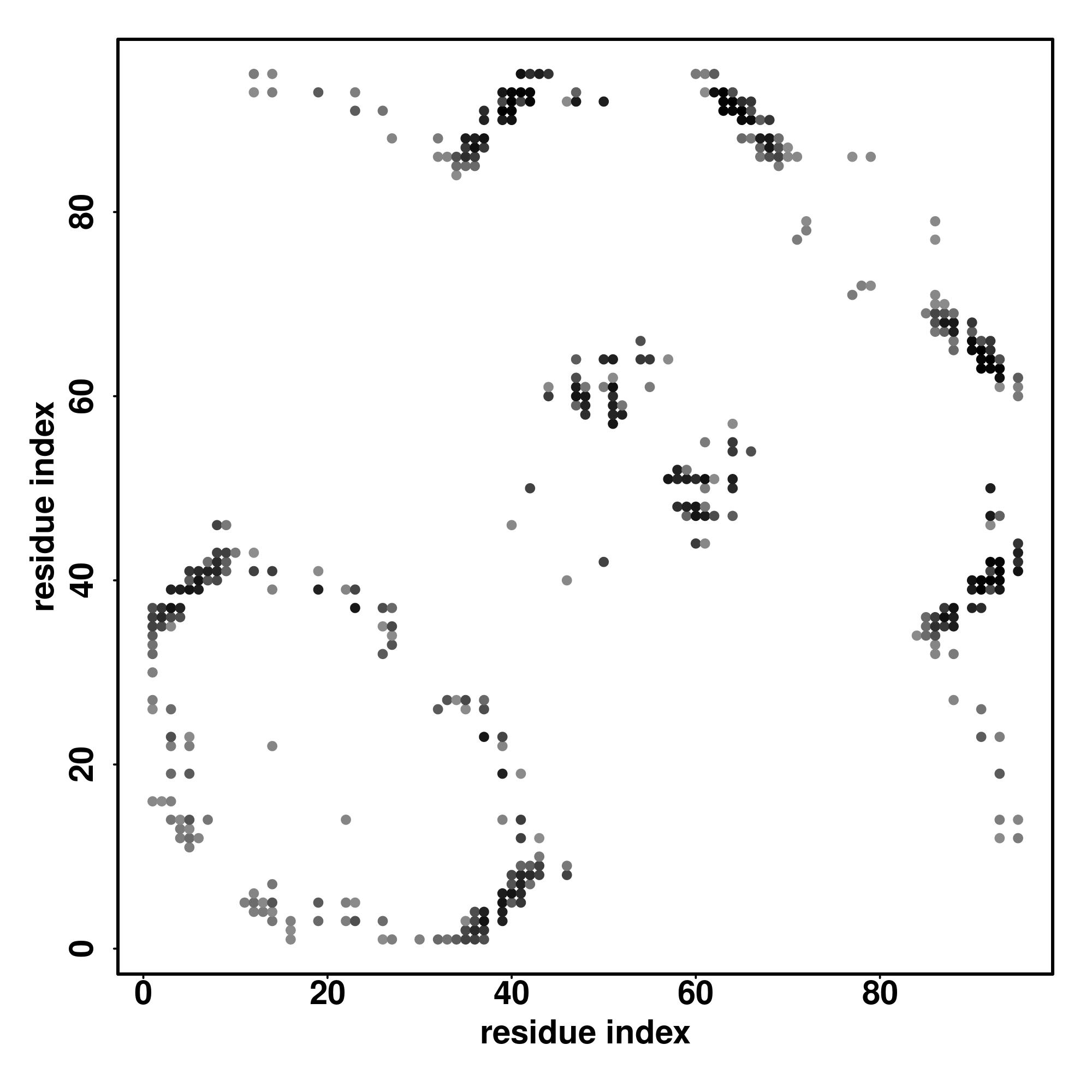 For the contact map, each dot represents a residue pair with predicted contact,