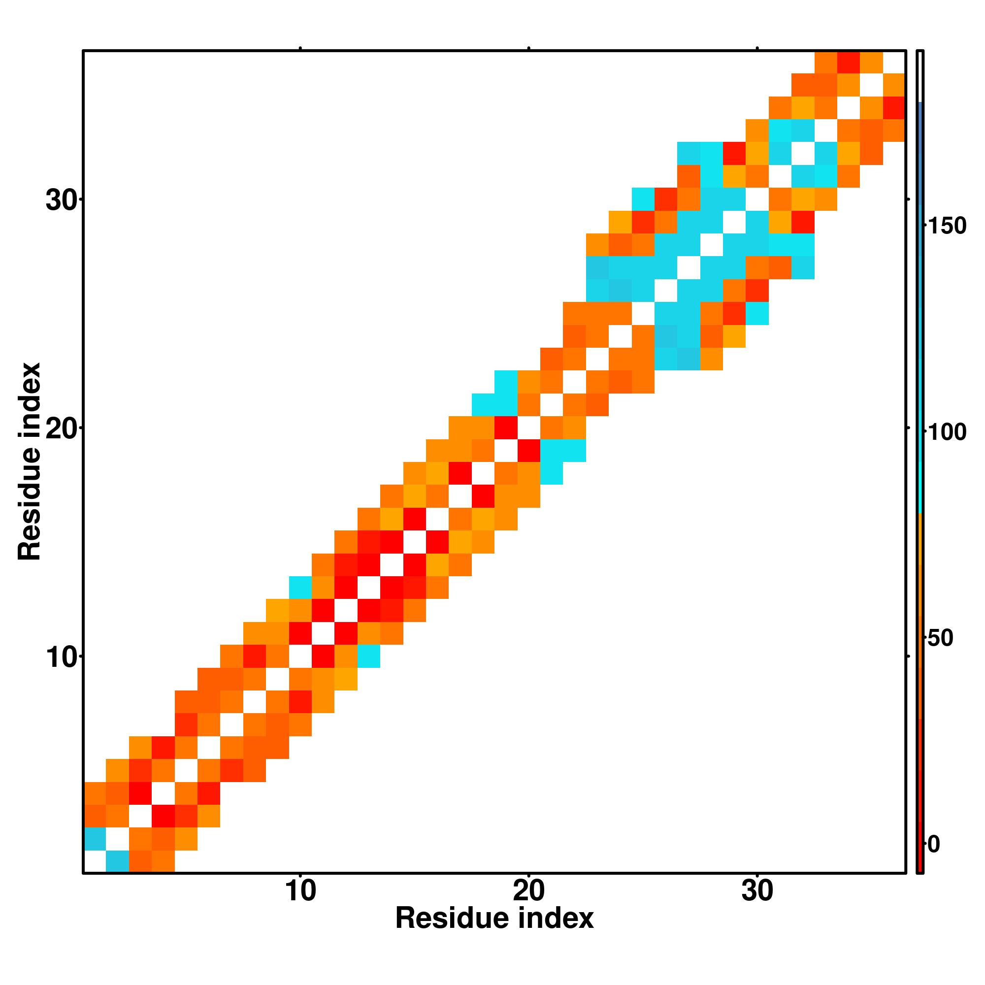 while for the distance map and hydrogen bond network, a color scale represents a distance of 1-20+ angstroms or a angle of 0-180 degree.